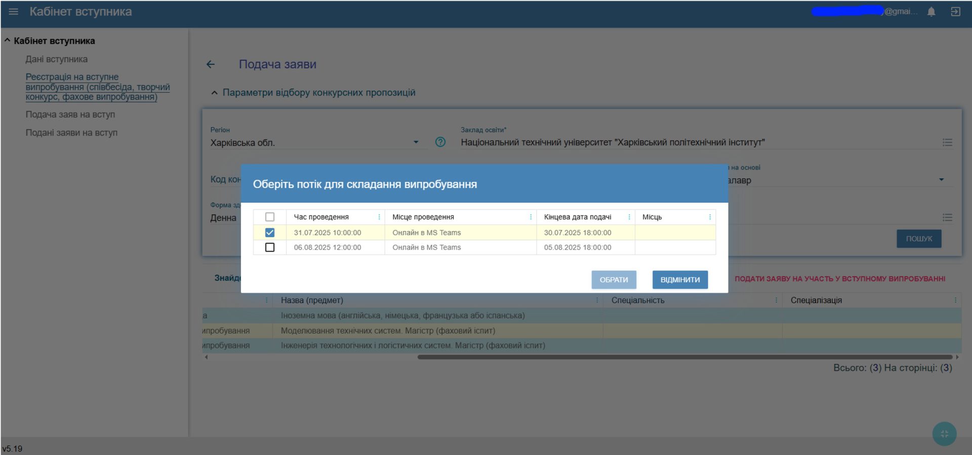- З’явиться перелік можливих дат випробувань – оберіть зручну для Вас і підтвердіть вибір натисканням «Обрати».