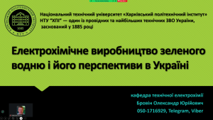 20 листопада відбувся профорієнтаційний онлайн-захід для учнів 9–11 класів закладів освіти Харківської області. Зустріч була присвячена ознайомленню майбутніх абітурієнтів із освітньою програмою кафедри та умовами вступу. Також доц. Бровін О.Ю. розповів при напрямки підготовки фахівців прочитав міні-лекцію на тему “Виробництво зеленого водню з використанням енергії відновлюваних джерел та його перспективи в Україні”.УПід час розповіді присутні розглянули особливості “кольорової” градації водню та детально зупинилися на методах його отримання шляхом електролізу. Окрему увагу було приділено практичному впровадженню водневих технологій в Україні, зокрема реалізації стратегічних проектів «Дунайська воднева долина» та «Воднева долина Закарпаття».