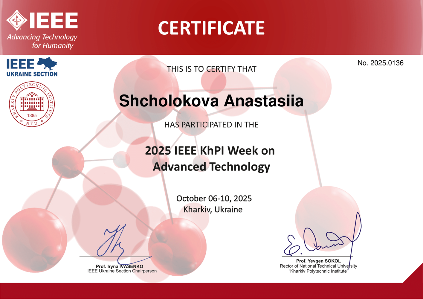 2025 IEEE 6th KhPI Week on Advanced Technology. Доповідь асп. Щолокової А.С. на тему “Effect of nitrate-containing compounds on the morphology of black chromium coatings”
