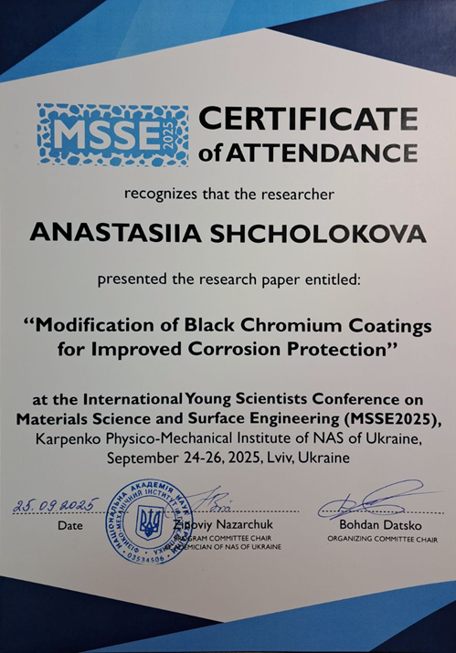International Young Scientists Conference on Materials Science and Surface Engineering 2025. Доповідь асп. Щолокової А.С. на тему «Модифікація покриттів чорним хромом для покращення корозійного захисту»