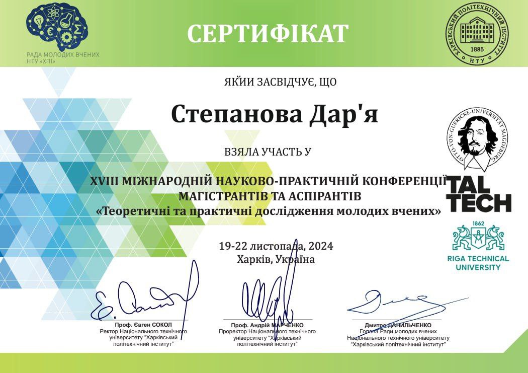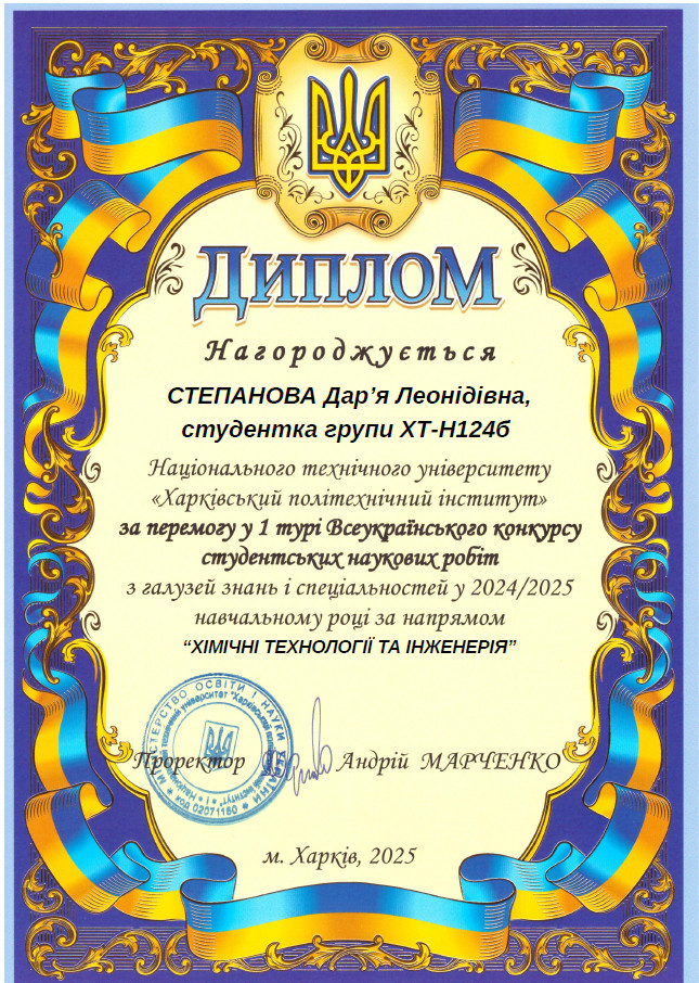 - 2024/2025 н.р.: Степанова Д.Л. (ХТ-Н124б), керівник д.т.н., доц. Майзеліс А.О.