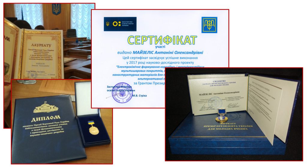 - Грант Президента для молодих вчених, 2017 р., к.т.н. Майзеліс А.О., робота «Електрохімічне формування корозійно- і механічностійких мультишарових покриттів, каталітично активних наноструктурних матеріалів для потреб машинобудування та альтернативної енергетики»