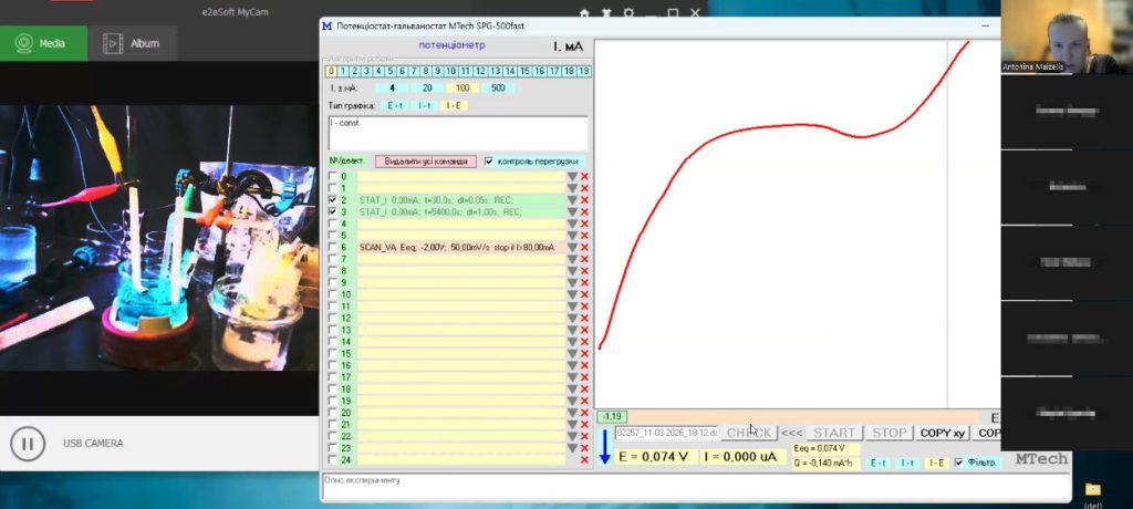 Перша лекція була присвячена спеціальному електрохімічному приладу – потенціостату. На прикладі вітчизняного приладу MTech Майзеліс А.О. ознайомила учнів із принципами його роботи, сферами використання та можливостями застосування під час розв’язання турнірних задач, а також у дослідженнях з хімії та фізики.