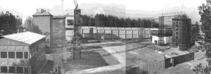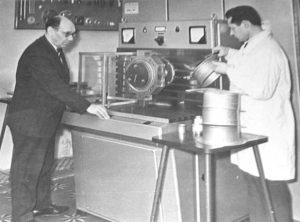Засновники вітчизняної технології магнітно-імпульсної обробки металів (МІОМ) доц. С. М. Фертик (ліворуч) та майбутній завідувач кафедри проф. І. В. Білий (праворуч) за дослідним виготовлюваним деталей на першій вітчизняній установці МИУ-20/1