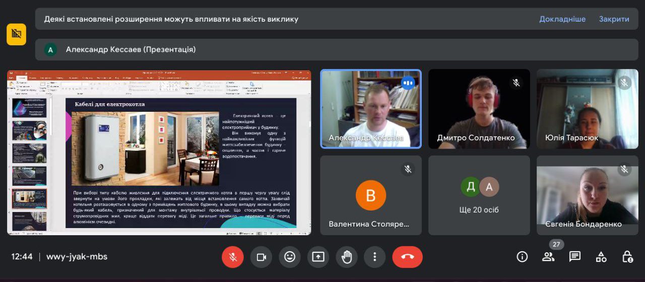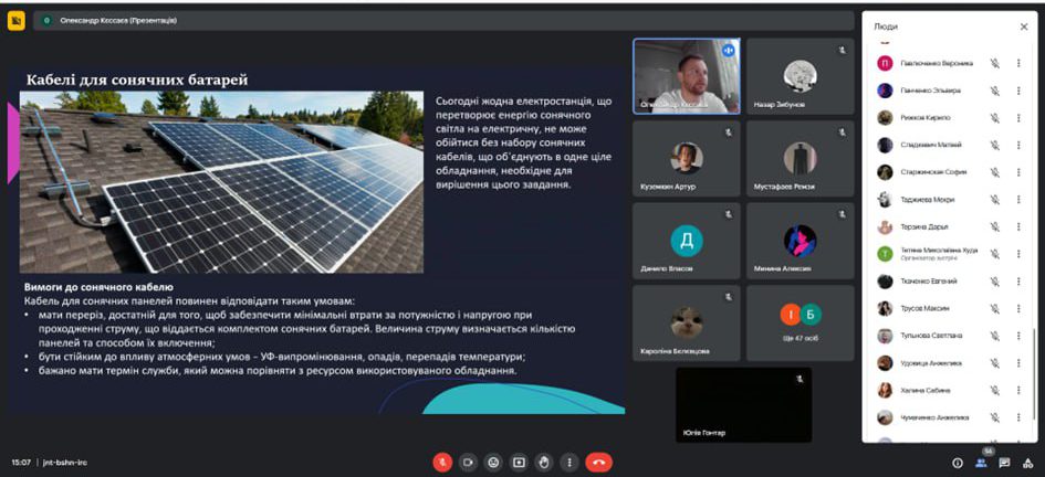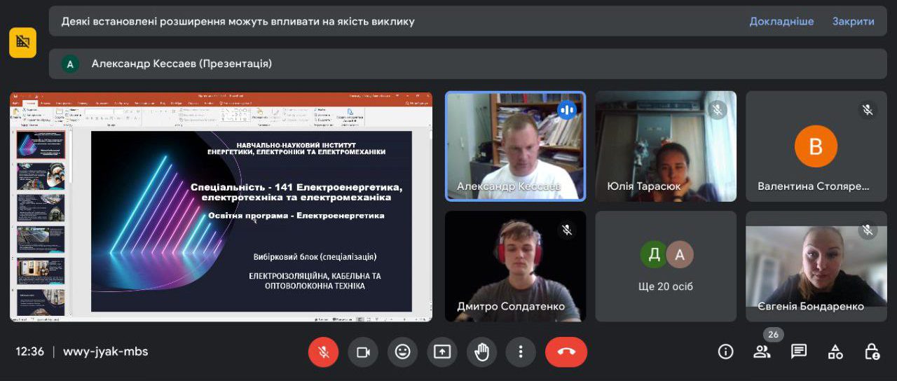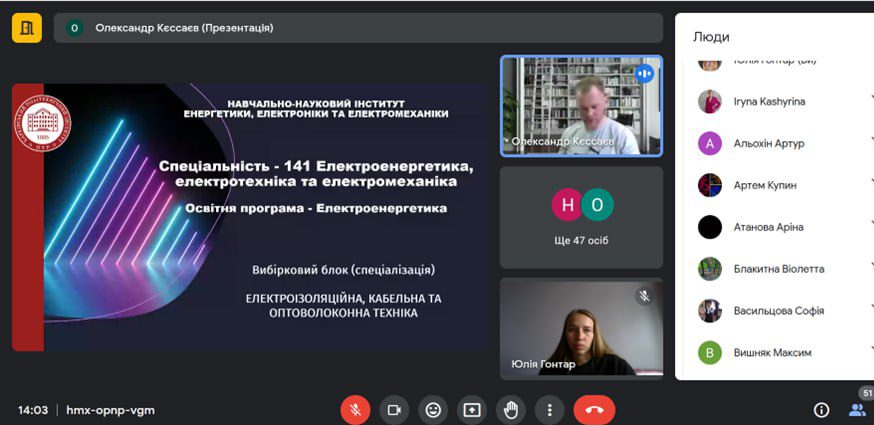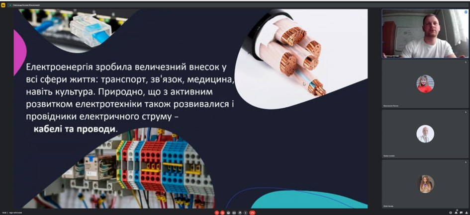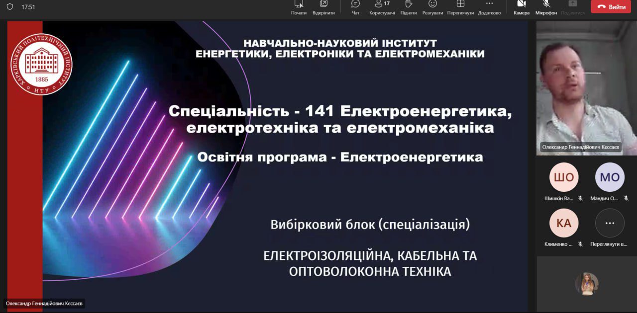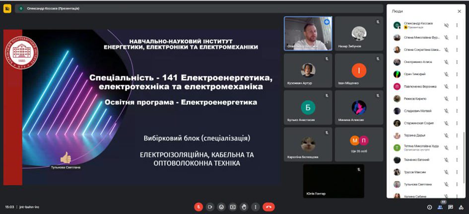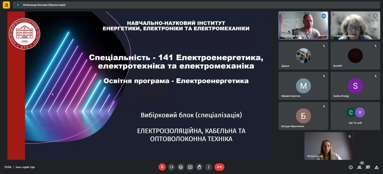Захід організував завідувач кафедри електроізоляційної та кабельної техніки доц. Кєссаєв О.Г., який розповів учням про можливості навчання за технічними спеціальностями та перспективи кабельної галузі. Онлайн-зустріч стала чудовою нагодою для школярів отримати відповіді на запитання про майбутню професію та зробити крок назустріч усвідомленому вибору кар’єрного шляху.
