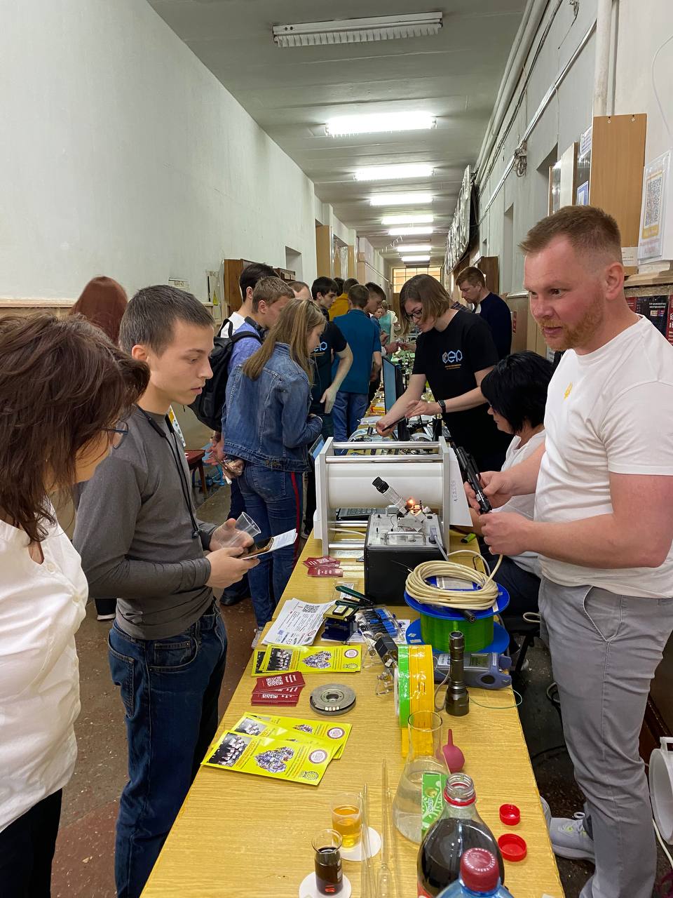 Від кафедри “Електроізоляційна та кабельна техніка” знайомив відвідувачів заходу безпосередньо завідувач кафедри Кєссаєв О.Г. Учні наочно спробували зварити оптичне волокно, отримали нові знання з електротехнічних матеріалів, а також дізналися про особливості передачі інформації.