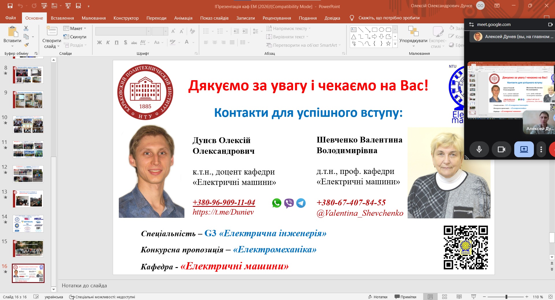 Доцент Дунєв О. О. розповів про особливості конкурсної пропозиції «Електромеханіка» у рамках 141 спеціальності та профілізації «Електричні машини», зробив акценти на важливості електричних машин (двигунів та генераторів) у виробництві електричної енергії, у побуті, електротранспорті та промисловості. Також представив фотографії кафедри, детально познайомив слухачів із навчальним процесом, науковими досягненнями наших студентів та можливістю міжнародних стажувань. Наприкінці свого виступу він залишив свої контакти у різних месенджерах та контакти кафедри із посиланням на сайт. У продовж презентації було задано цікаві питання, на які доц. Дунєв О. О. дав вичерпні відповіді та запросив абітурієнтів вступати саме до нас. Також файл презентації було завантажено у чат групи, де студенти, згодом можуть її передивлятися та задавати додатково свої уточнювальні запитання.