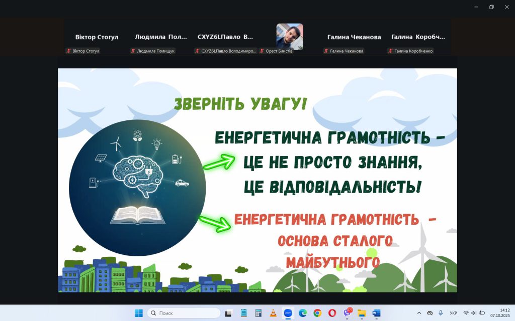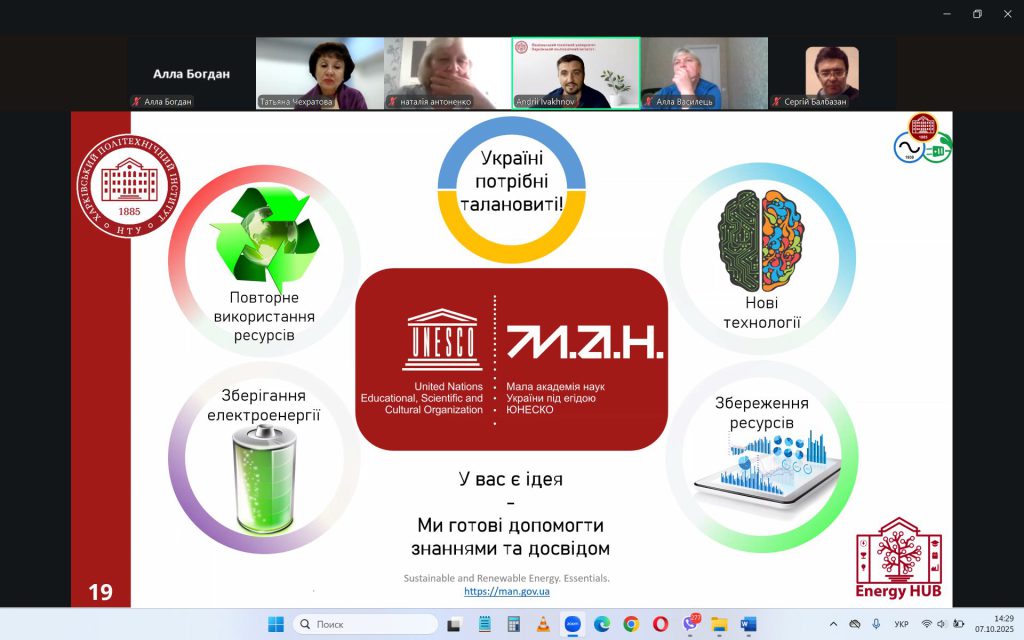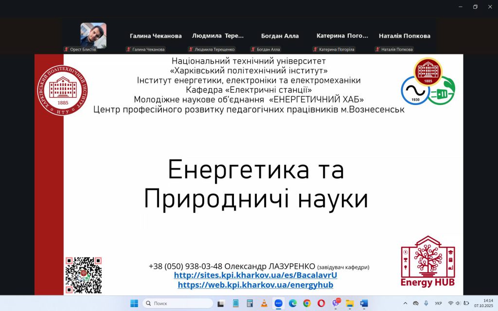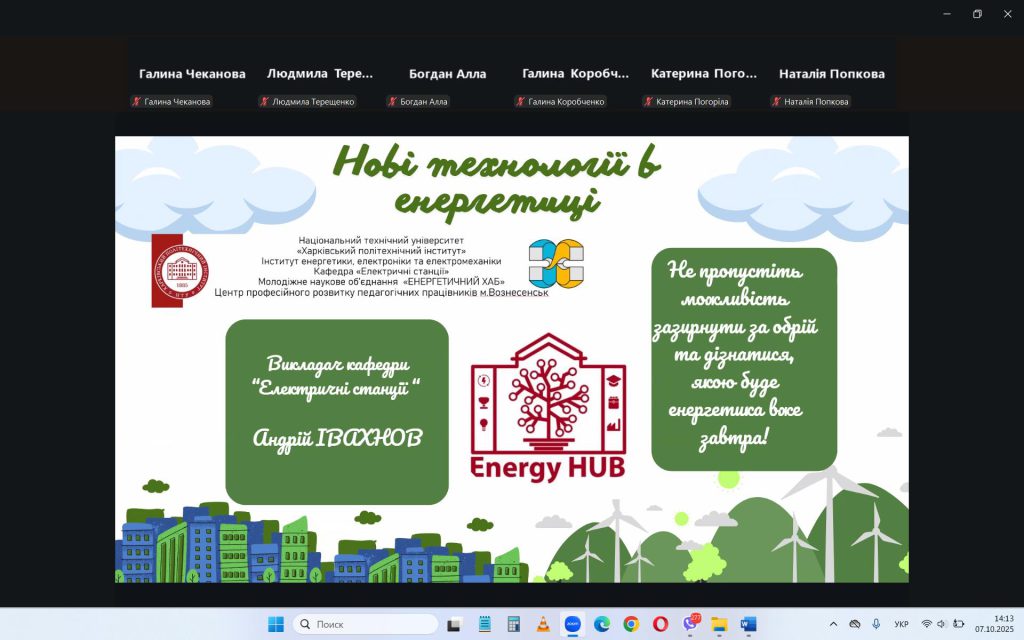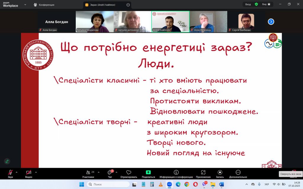 Викладач кафедри «Електричні станції» Андрій Івахноі — поділився актуальними науковими дослідженнями, розповів про новітні технології та тренди сучасної енергетики. Його виступ став містком між наукою та шкільною освітою, показавши, як сучасні відкриття можна адаптувати для уроків.