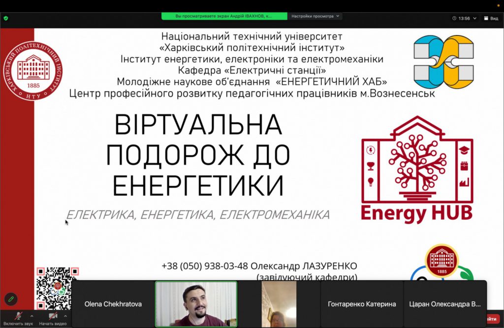 12 та 22 листопада 2023 р. асистент кафедри «Електричні станції» Андрій Івахнов у межах співпраці НТУ “ХПІ” з Центром професійного розвитку педагогічних працівників м. Вознесенськ провів семінари «Віртуальна подорож до енергетики» для учнів 10-11 класів ліцею «Інсайт», ліцею ім. Т. Шевченка та Вознесенської ЗОШ №2.