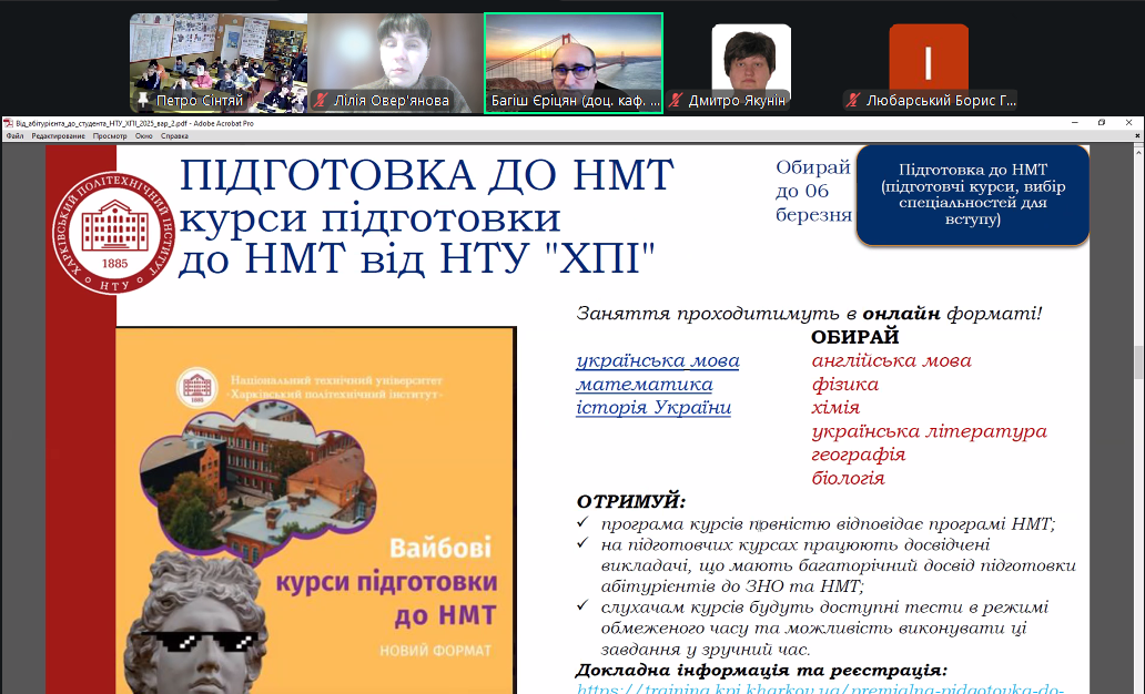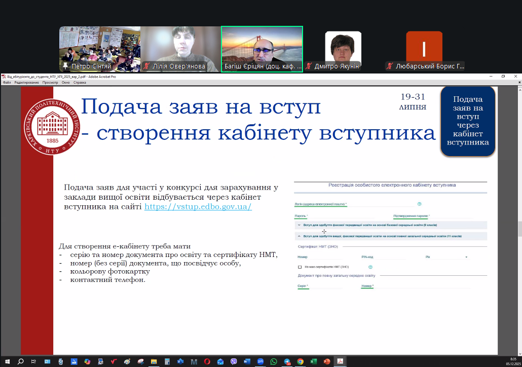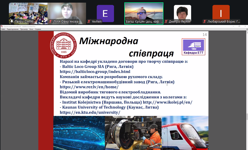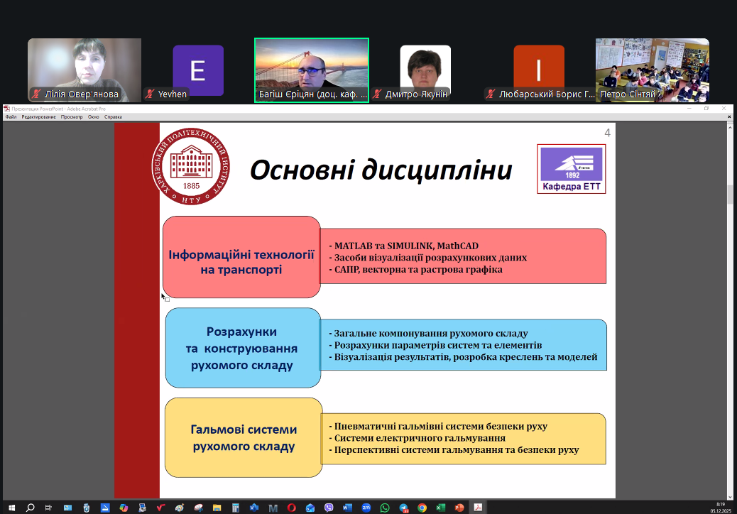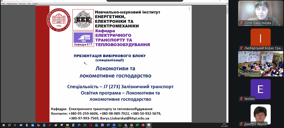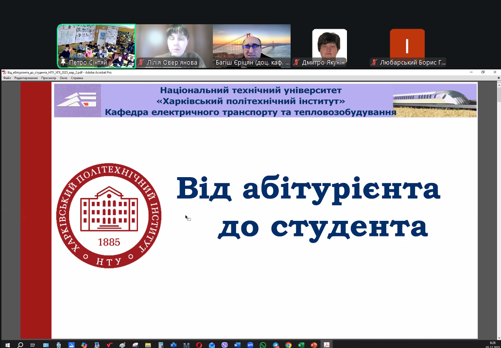 05 грудня 2025 року відбулася чергова, вже традиційна, онлайн-зустріч кафедри Електричного транспорту та тепловозобудування Національного технічного університету «ХПІ» з учнями Полтавського професійного ліцею транспорту. Ці щорічні заходи стали важливою ланкою профорієнтації та міцним мостом між середньою спеціальною та вищою освітою, адже проходять завжди дуже цікаво та жваво.