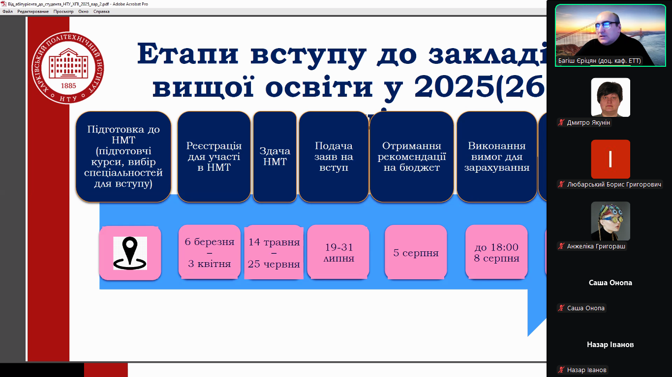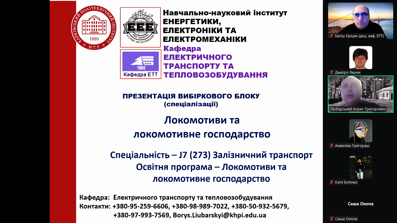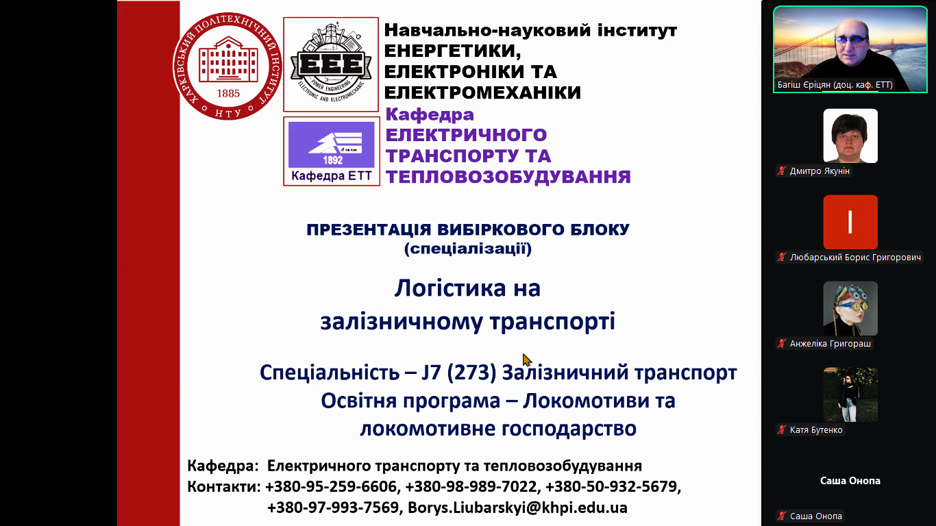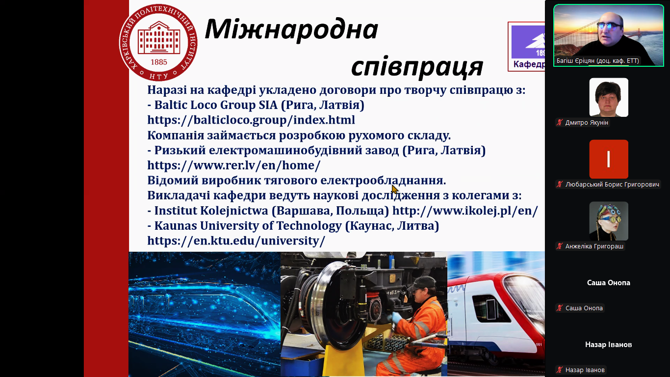 11 грудня 2025 року відбулася чергова, вже традиційна, онлайн-зустріч кафедри Електричного транспорту та тепловозобудування Національного технічного університету «ХПІ» зі здобувачами освіти Кременчуцького фахового коледжу транспортної інфраструктури та технологій. Ці профорієнтаційні заходи стали важливою ланкою взаємодії між середньою фаховою та вищою освітою, адже щоразу проходять надзвичайно цікаво, насичено та результативно.