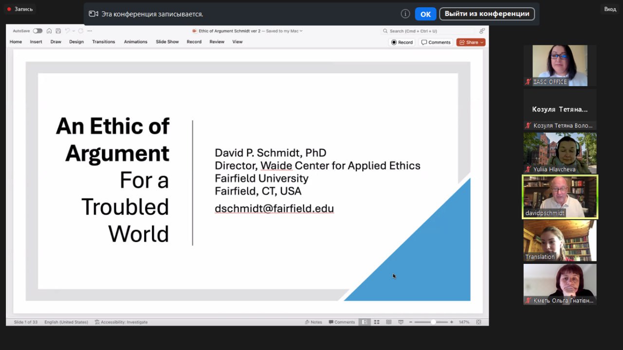 Цінністю даного семінару було те, що його спікером був Девід П. Шмідт – доцент кафедри ділової етики Школи бізнесу Долана та директор Центру прикладної етики Патріка Дж. Вейда в Університеті Ферфілд у Коннектикуті, США.