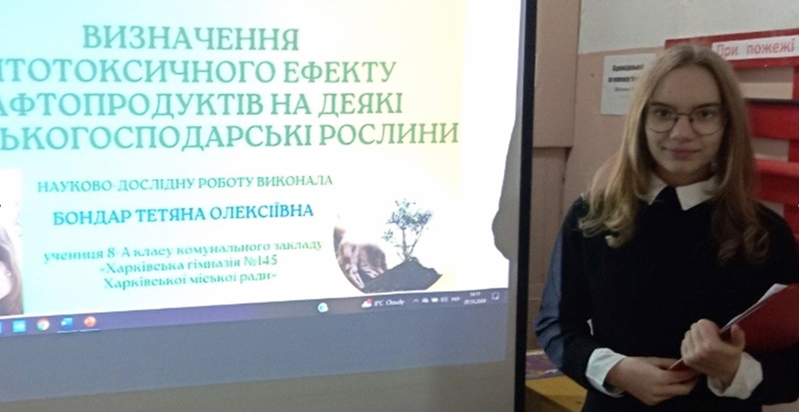 T. Bondar (8th grade, Lyceum No. 145) presented her research on “Determining the phytotoxic effect of petroleum products on certain agricultural plants” in the “Environmental Protection and Rational Nature Management” section, securing 1st place regionally and 2nd place nationally. The analyzed soil samples were taken from the aftermath of a massive oil depot fire triggered by a drone strike in Kharkiv’s Nemyshlianskyi district (February 2024). Academic Advisor: Head of the Department, PhD, Assoc. Prof. O.V. Shestopalov.
