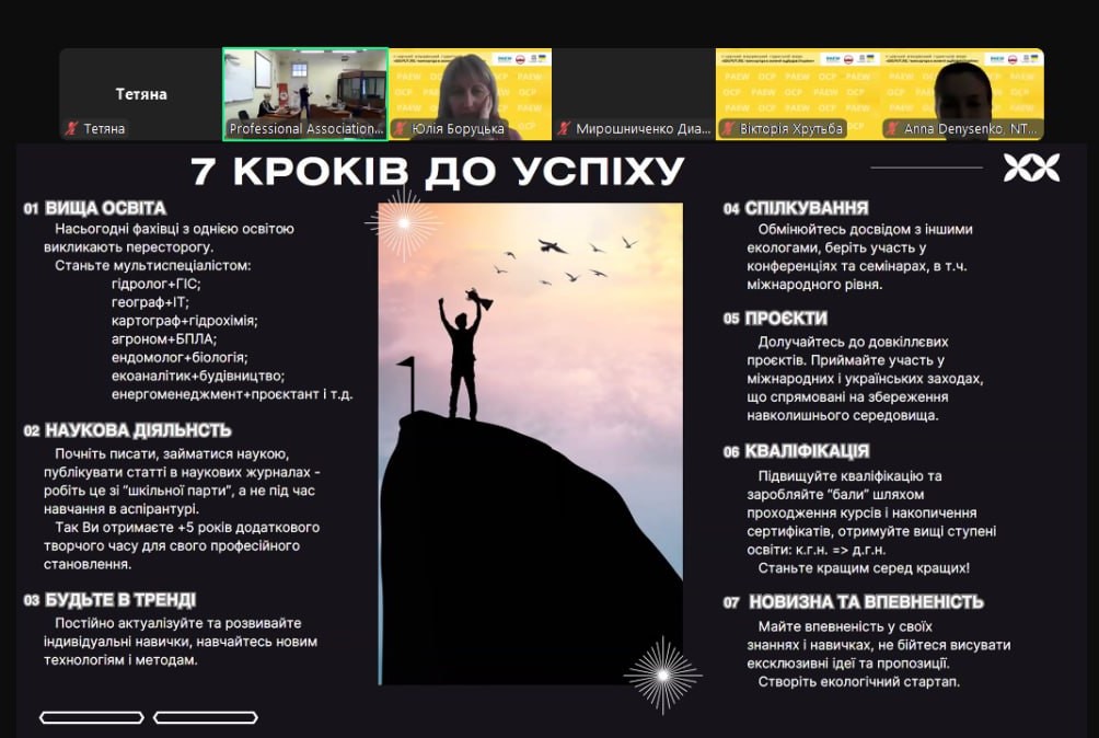 Відповіді на такі не прості запитання краще шукати за підтримки фахівців. Саме тому студенти ОП «Інженерна екологія» та «Технології захисту навколишнього середовища» 20 березня відвідали V щорічний всеукраїнський студентський форум «ESG FUTURE: твоя кар’єра в зеленій відбудові України», який проходив у гібридному форматі. Доєднавшись онлайн, студенти отримали знання та рекомендації не тільки про те, які 7 кроків є запорукою затребуваності фахівця на ринку праці, а й дізнались про практичні кейси повоєнної зеленої відбудови України, які вже розроблені фахівцями. Дуже цікавої та змістовною була розповідь про майбутнє атомної та відновлювальної енергетики в Україні.