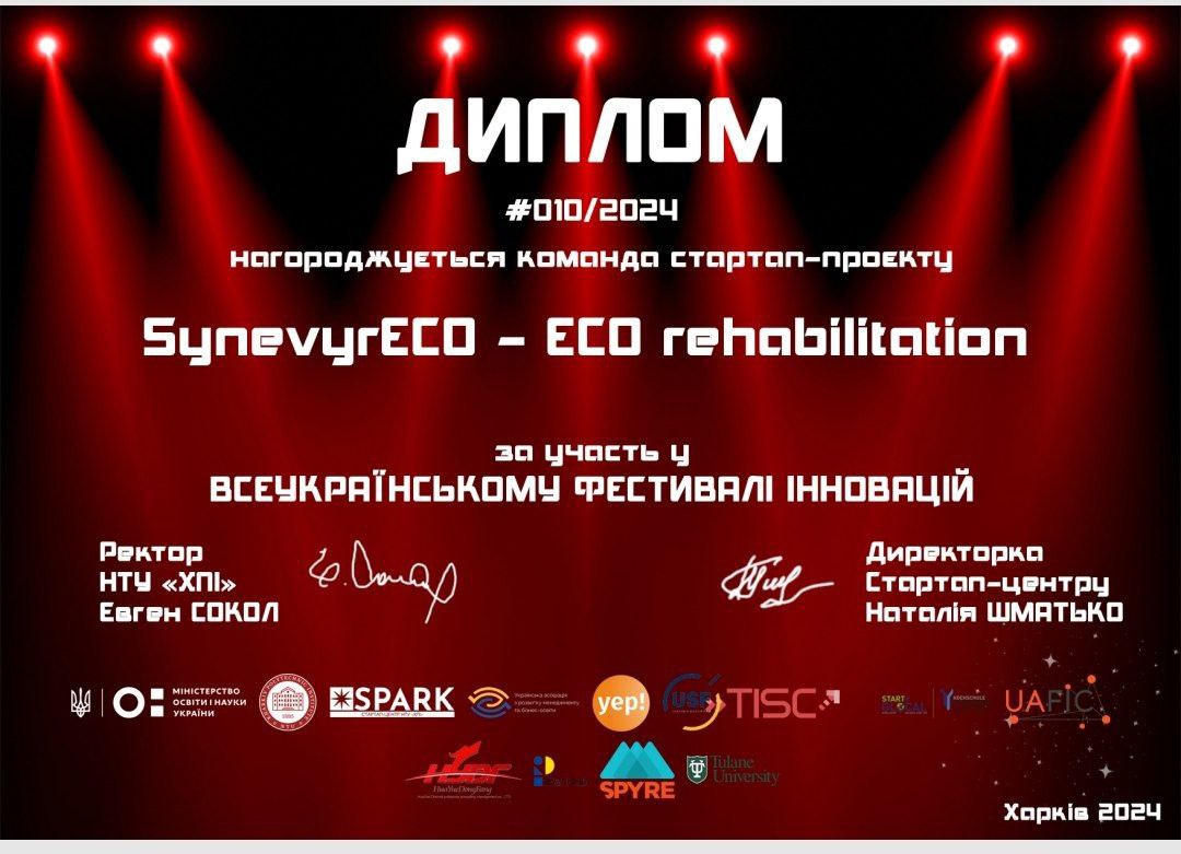 Участь у відбірковому етапі взяли два проекти від нашої кафедри. Проект “SynevyrECO -ECO rehabilitation” про медичну реабілітацію, яка поєднується з вивченням цілющої сили карпатських трав та складанням композицій на їх основі від магістра Місик Ярини (науковий керівник – проф. Зінченко М.Г.) отримав позитивні оцінки від журі, але не потрапив у фінальну частину