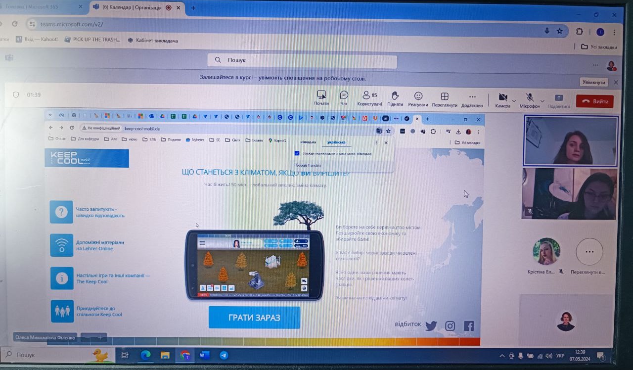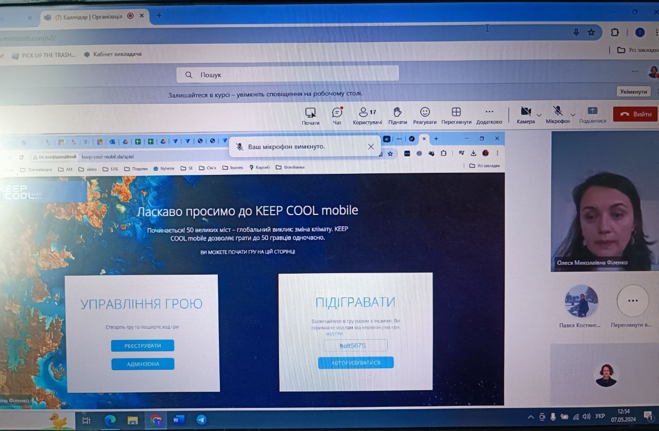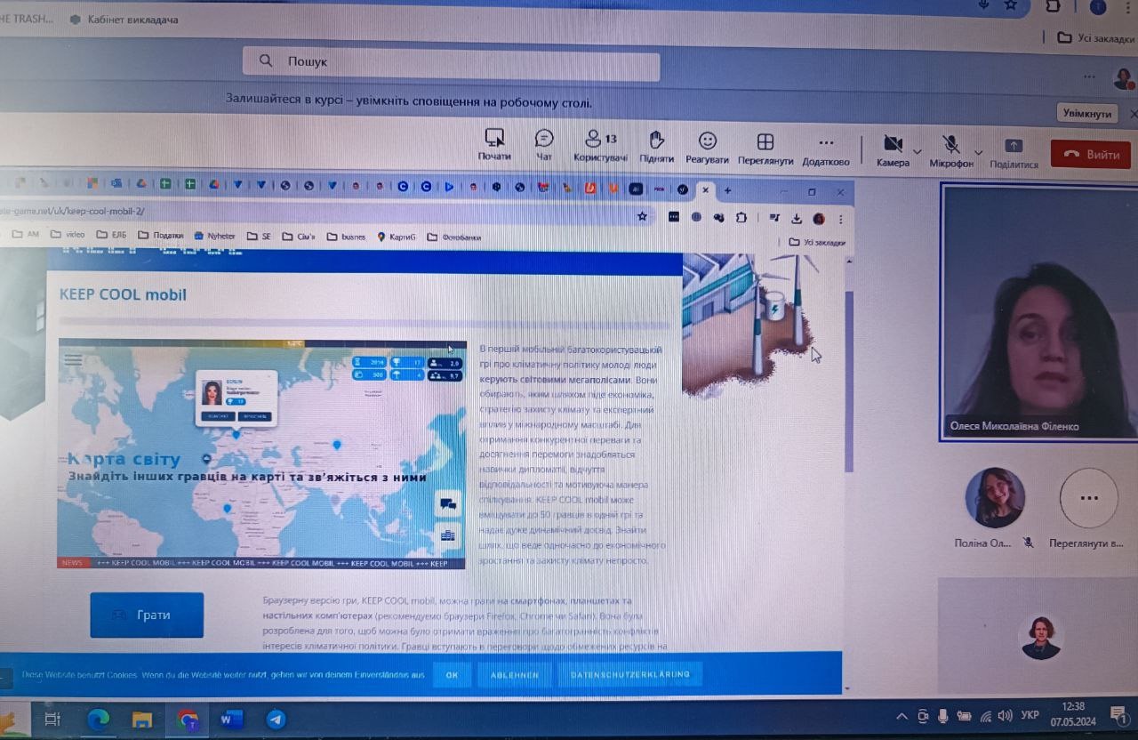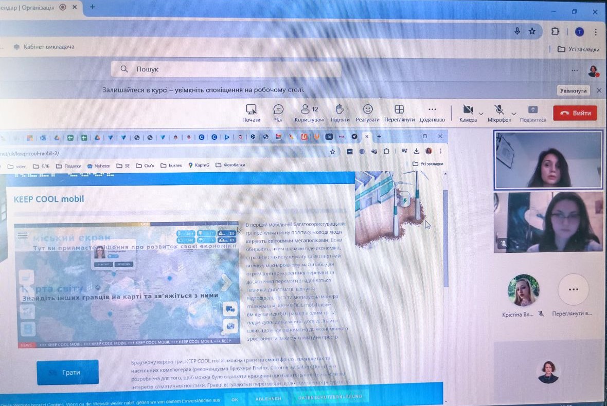 Викладачі кафедри доц. Філенко О.М. та Тихомирова Т.С. провели практичне заняття 7 травня 2024 р для студентів 2-4 курсів у формі ігрового проектування, а саме з використанням он лайн версії екологічної гри Keep Cool.