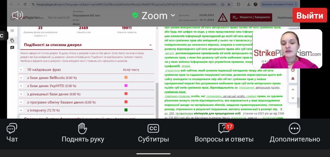 Для розуміння алгоритмів роботи нової програми, всіх особливостей та нюансів 17 грудня 2024 р завдяки науково-технічній бібліотеці НТУ ХПІ було організовано вебінар для користувачів від команди StrikePlagiarism.com, який відвідали всі вільні у той час викладачі кафедри.