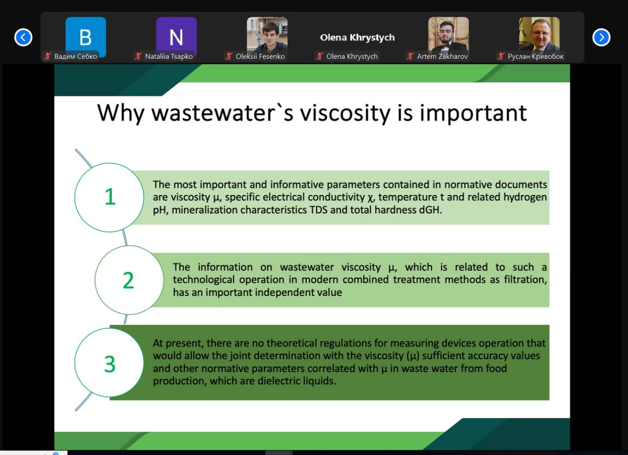 Свої результати наукової роботи представили й викладачі та аспіранти кафедри у секції №8 «Dielectrics and electrical insulation» (https://khpiweek.ieee.org.ua/wp-content/uploads/2024/09/Program-KhPIWeek-2024.pdf ). 11 жовтня на ранковій секції усних докладів доц. каф. Антоніна Сакун презентувала результати колективної роботи, виконаної під керівництвом проф. кафедри, д.т.н. Вадима Себко у співпраці з колегами з   National Technical University of Ukraine “Igor Sikorsky Kyiv Polytechnic Institute” присвячену розробці нового методу комплексного вимірювання параметрів стічних вод різноманітних харчових виробництв для вибору оптимальних методів їх очистки.