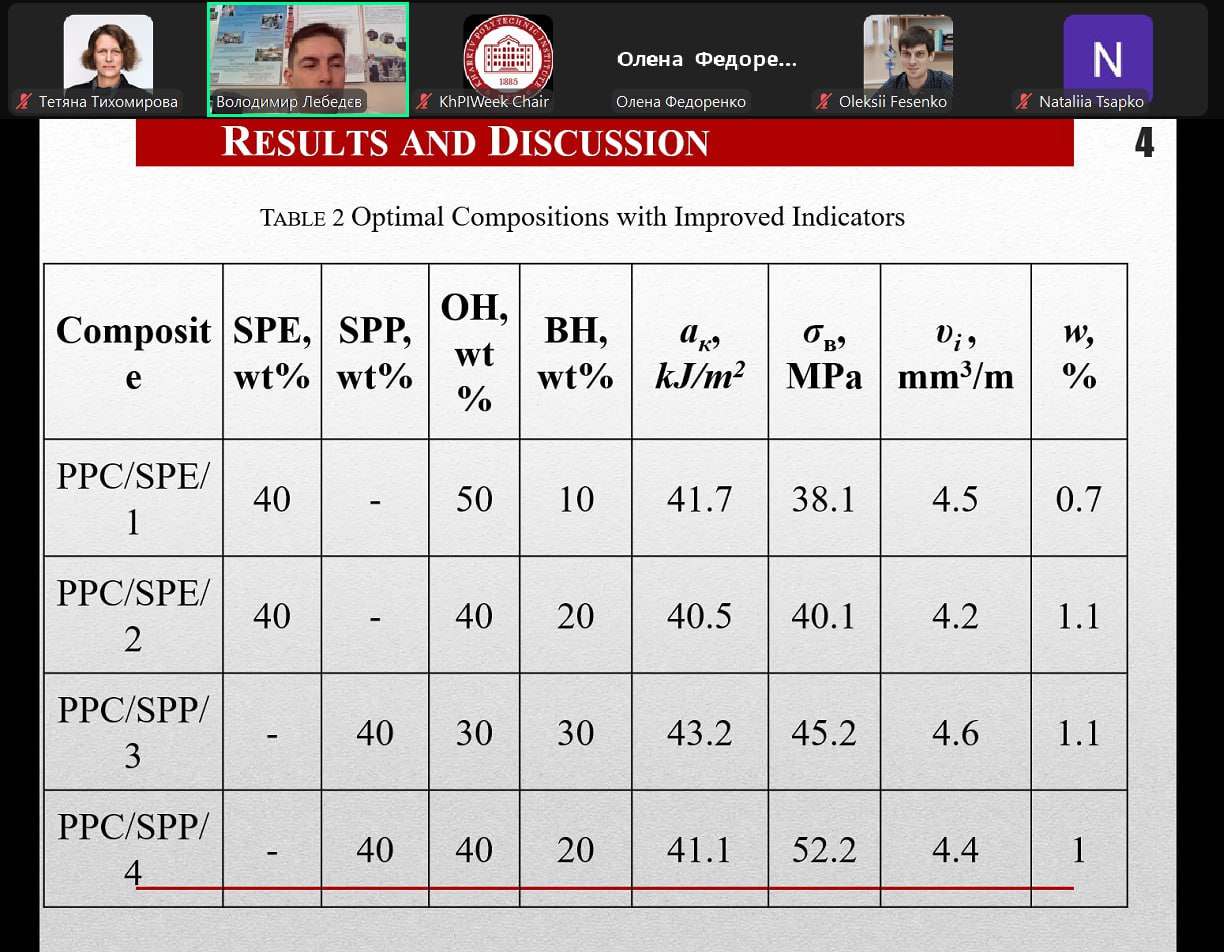 Також у цій секції була представлена спільна робота доц. кафедри ХТПЕ  Тетяни Тихомирової з колегами з кафедри технології пластичних мас та біологічно активних полімерів та ХНУМГ ім. О.М. Бекетова на тему «Research on the Impact of Climatic Factors on the Properties of PlantPolymer Composites», яка присвячена розробці полімерних композицій зі вторинних полімерних матеріалів з рослинними домішками та їх стійкості до дії кліматичних факторів. Важливість дослідження таких композицій полягає у тому, що вони базуються на відходах як полімерної продукції, так й залишках переробки рослин, в даному випадку вівса та гречки. Використання залишків різноманітних виробництв для створення нових полімерних композицій є одним з методів зменшення загальної кількості відходів та відповідає принципам циркулярної економіки. Доповідь цього колективу авторів представляв доц. каф. технології пластичних мас та біологічно активних полімерів  Володимир Лебедєв.