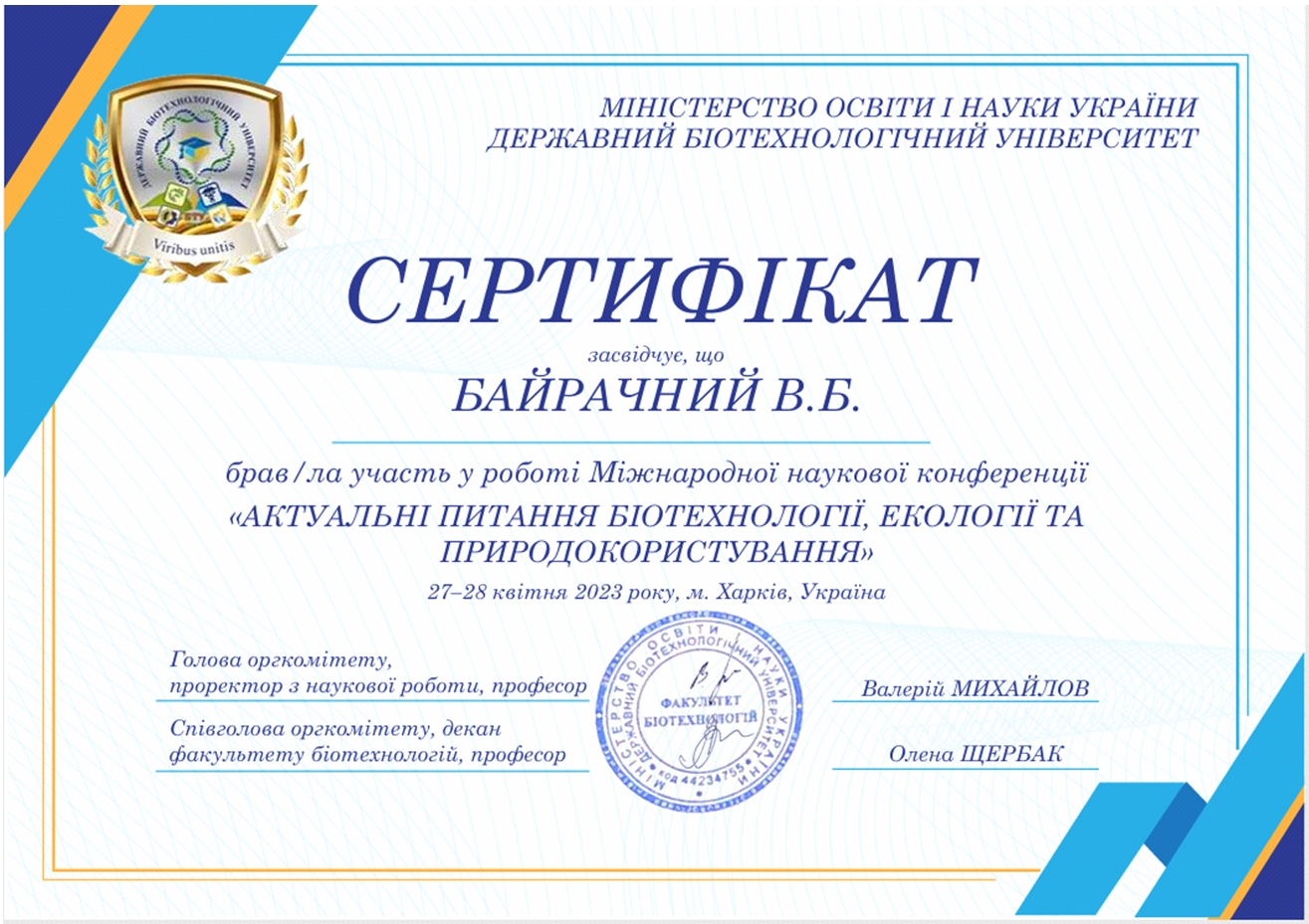 - Стажування у НТЦ «Екомаш», тема: «Дослідження нових конструкційних та функціональних матеріалів для використання у хімічній інженерії» з «20» вересня 2022 року по «25» листопада 2022 року (обсяг годин: 180 годин (6 кредитів ЕКТС)). Наказ НТУ «ХПІ» №1533С від 18.12.2022 р.