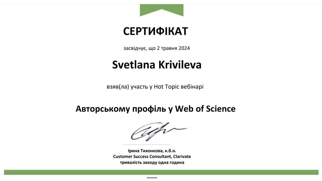 Стажування у НТЦ «Екомаш», тема: «Нові технології в інженерній екології, сучасні методи вимірювань фізико-хімічних параметрів матеріалів, виробів та речовин. Екологічне управління в організації» з «20» вересня 2022 року по «25» листопада 2022 року (обсяг годин: 180 годин (6 кредитів ЕКТС)). Наказ НТУ «ХПІ» №1533С від 18.12.2022р.