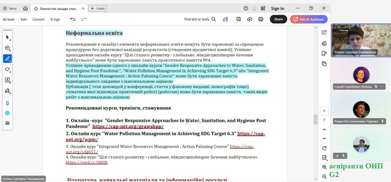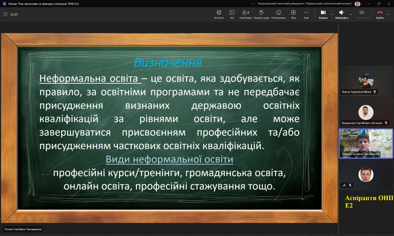 З метою активізації та поширення практики визнання неформальної освіти під час навчання в межах діяльності Студентського наукового гуртка «Екологічний клуб «Я-Еколюдина» (https://web.kpi.kharkov.ua/htpe/ychebpro/naukove-tovaristvo/) викладачами кафедри Тихомировою Т.С. та Босюк А.С. було проведено семінар «Порядок визнання результатів неформальної освіти в НТУ ХПІ» для студентів кафедри та майбутніх докторів філософії всіх освітніх програм.