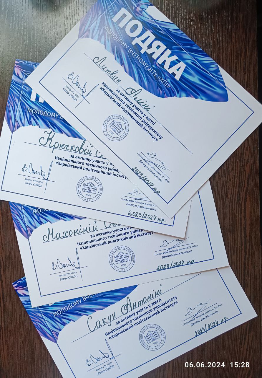 За підсумками 2023/2024 навч року четверо молодих науковиць нашої кафедри отримали подяку від Ради молодих вчених НТУ ХПІ.