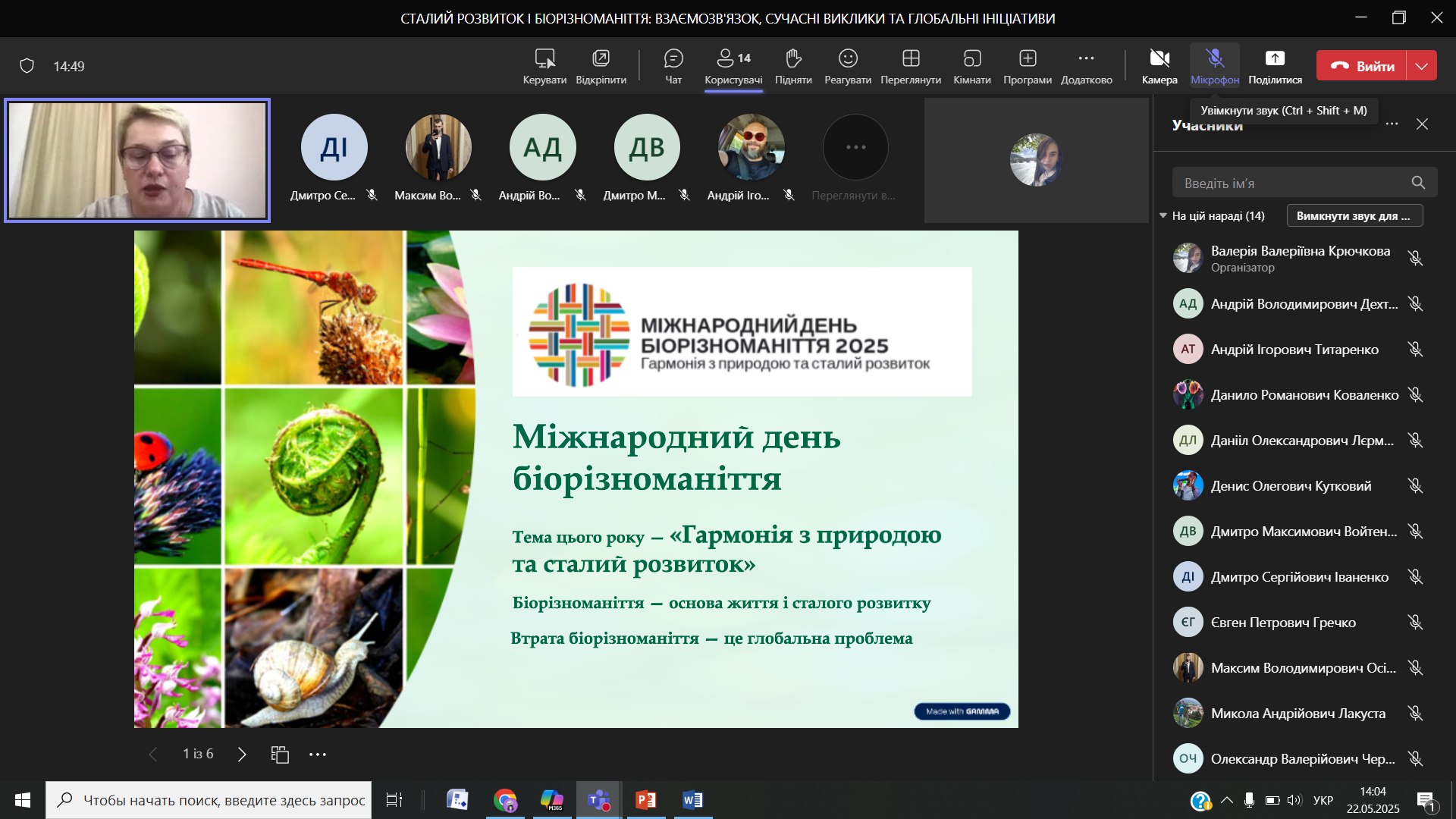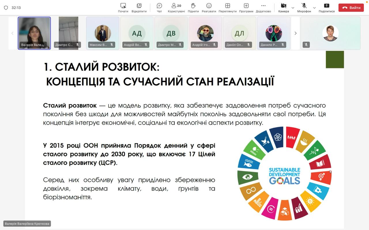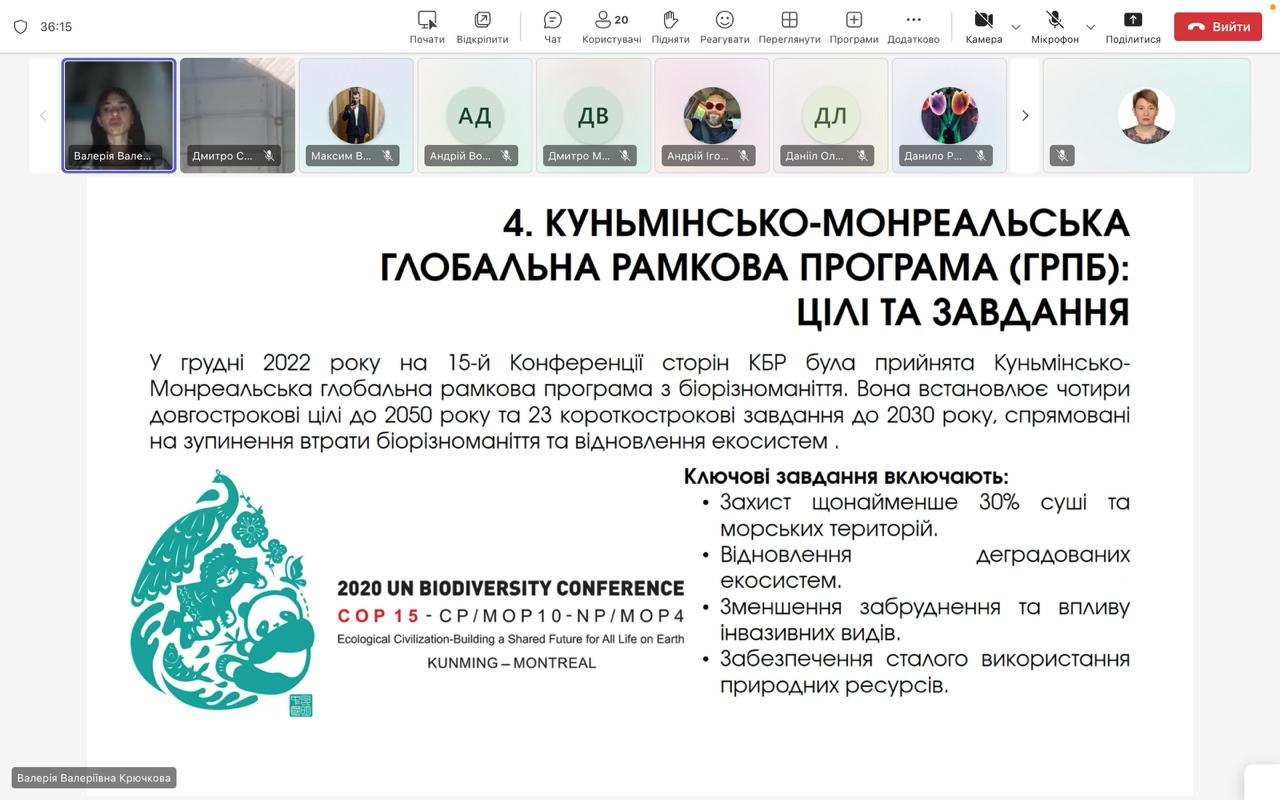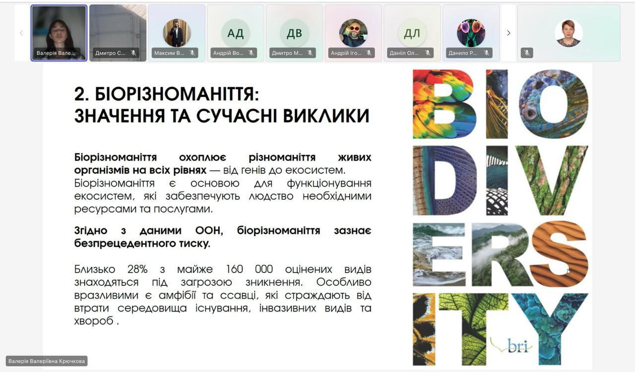 Враховуючі он-лайн форма навчання, 22 травня 2025 року викладачі кафедри провели відкриту інтерактивну лекцію до Міжнародного дня біологічного різноманіття. Доцент кафедри, Новожилова Т.Б. та асистент кафедри Крючкова В.В. підготували презентацію, де детально розглянули основні положення Куньмінсько-Монреальскої рамкової програми по біорізноманіттю, її зв’язок з завданнями сталого розвитку, адаптацію до поточних умов в країні, а також показали можливий вклад кожного громадянина тут й зараз у збереження біорізноманітті.