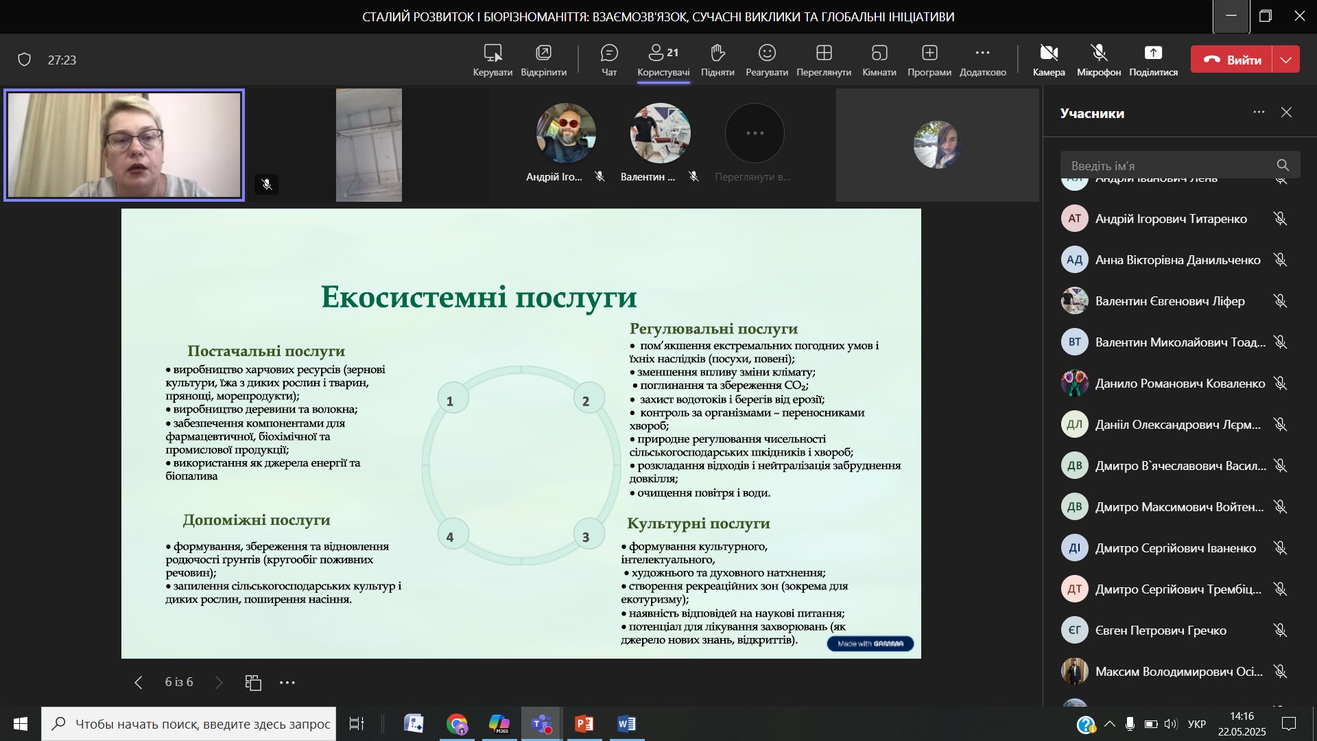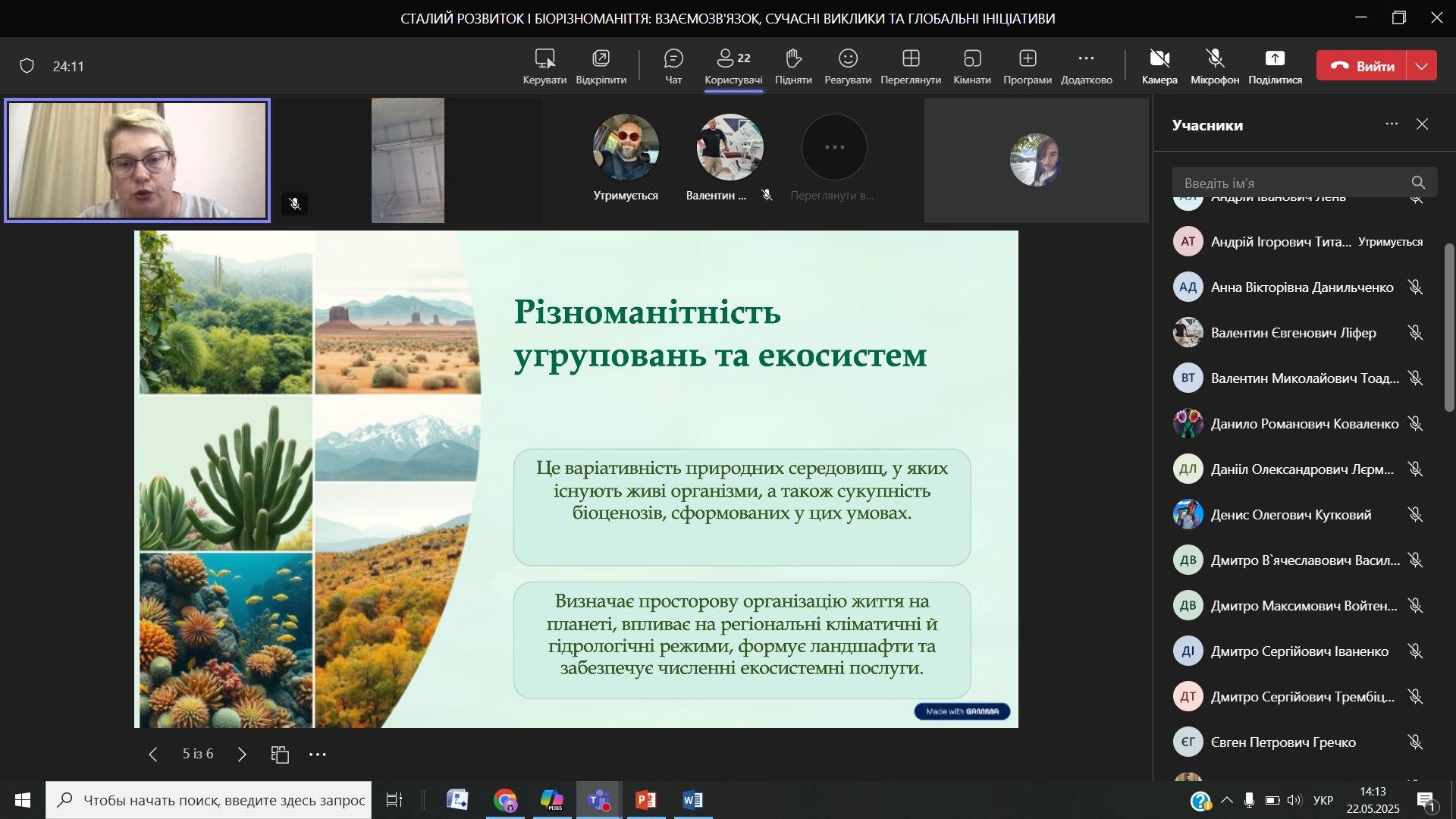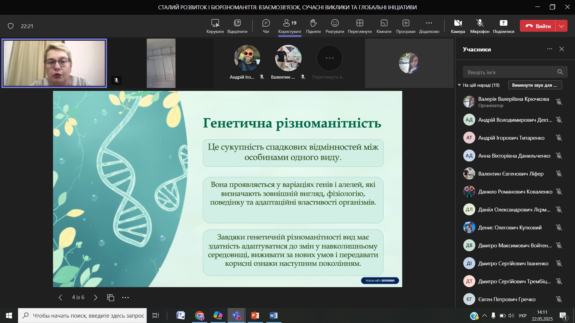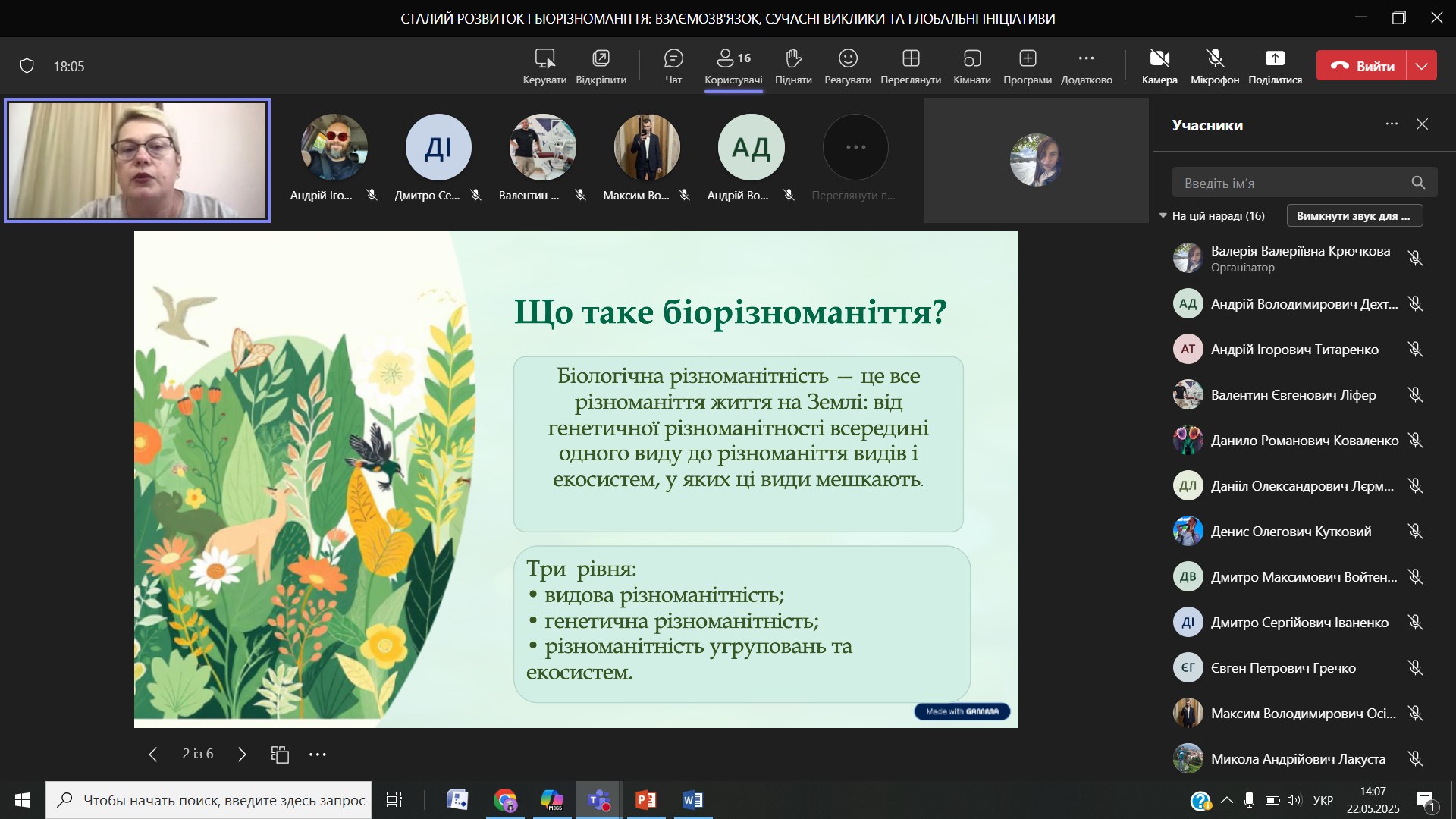 Враховуючі он-лайн форма навчання, 22 травня 2025 року викладачі кафедри провели відкриту інтерактивну лекцію до Міжнародного дня біологічного різноманіття. Доцент кафедри, Новожилова Т.Б. та асистент кафедри Крючкова В.В. підготували презентацію, де детально розглянули основні положення Куньмінсько-Монреальскої рамкової програми по біорізноманіттю, її зв’язок з завданнями сталого розвитку, адаптацію до поточних умов в країні, а також показали можливий вклад кожного громадянина тут й зараз у збереження біорізноманітті.
