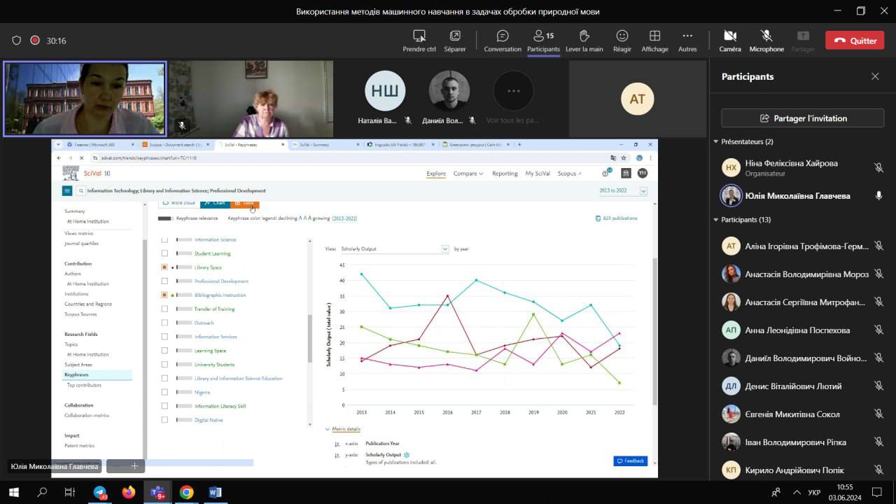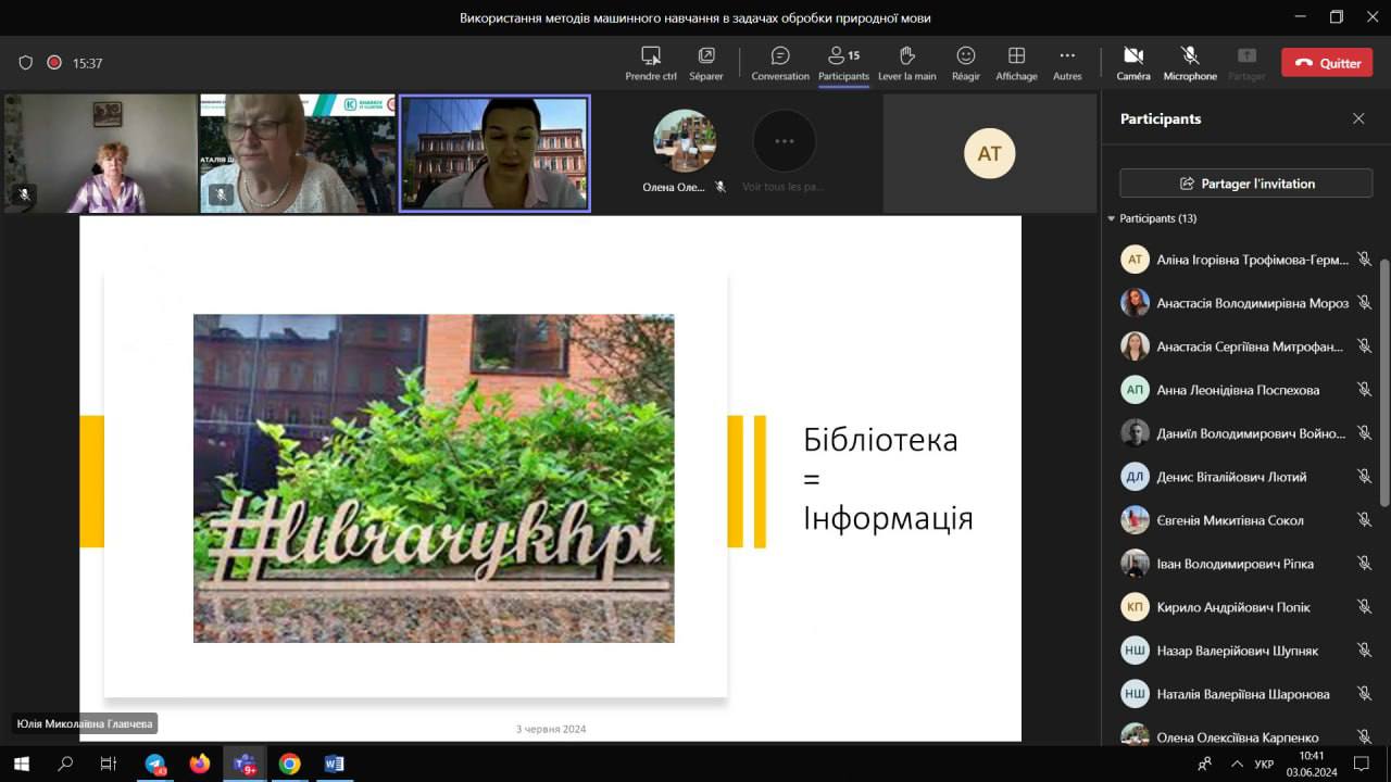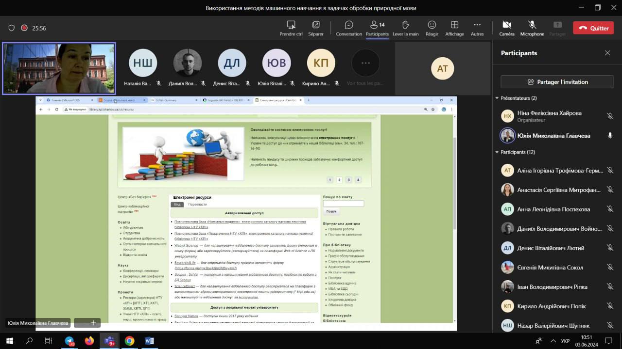 3 червня 2024 р. у рамках курсу «Використання методів машинного навчання в задачах обробки природної мови» відбулася лекція для студентів-магістрів очного та заочного відділення кафедри інтелектуальних комп’ютерних систем, проведена запрошеним експертом (стейкхолдером) на тему: «Науково-технічна бібліотека: галузь застосування».