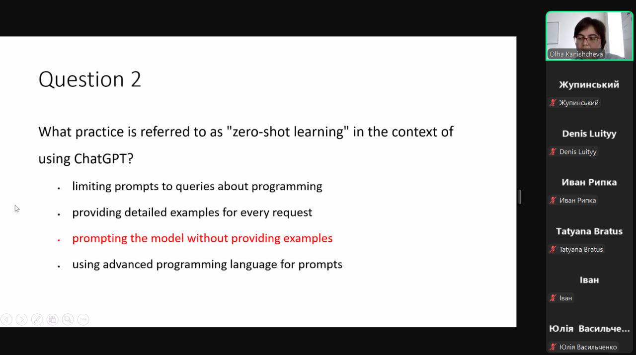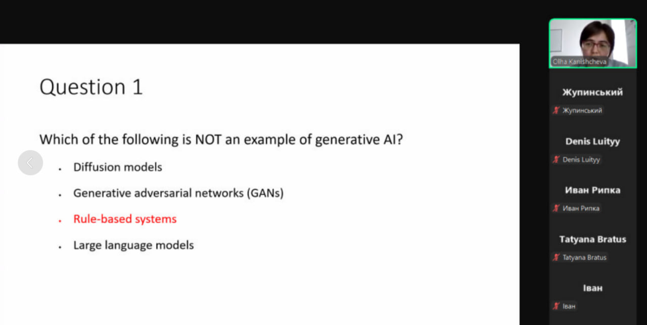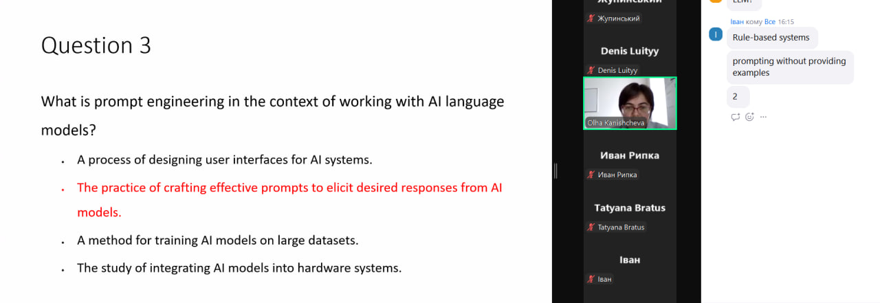 10 червня 2024 р. у рамках курсу «Використання методів машинного навчання в задачах обробки природної мови» відбулася лекція для студентів-магістрів очного та заочного відділення кафедри інтелектуальних комп’ютерних систем, проведена запрошеним експертом (стейкхолдером) на тему: «Prompt Engineering Course: Introduction to Gen AI and Prompt Engineering».