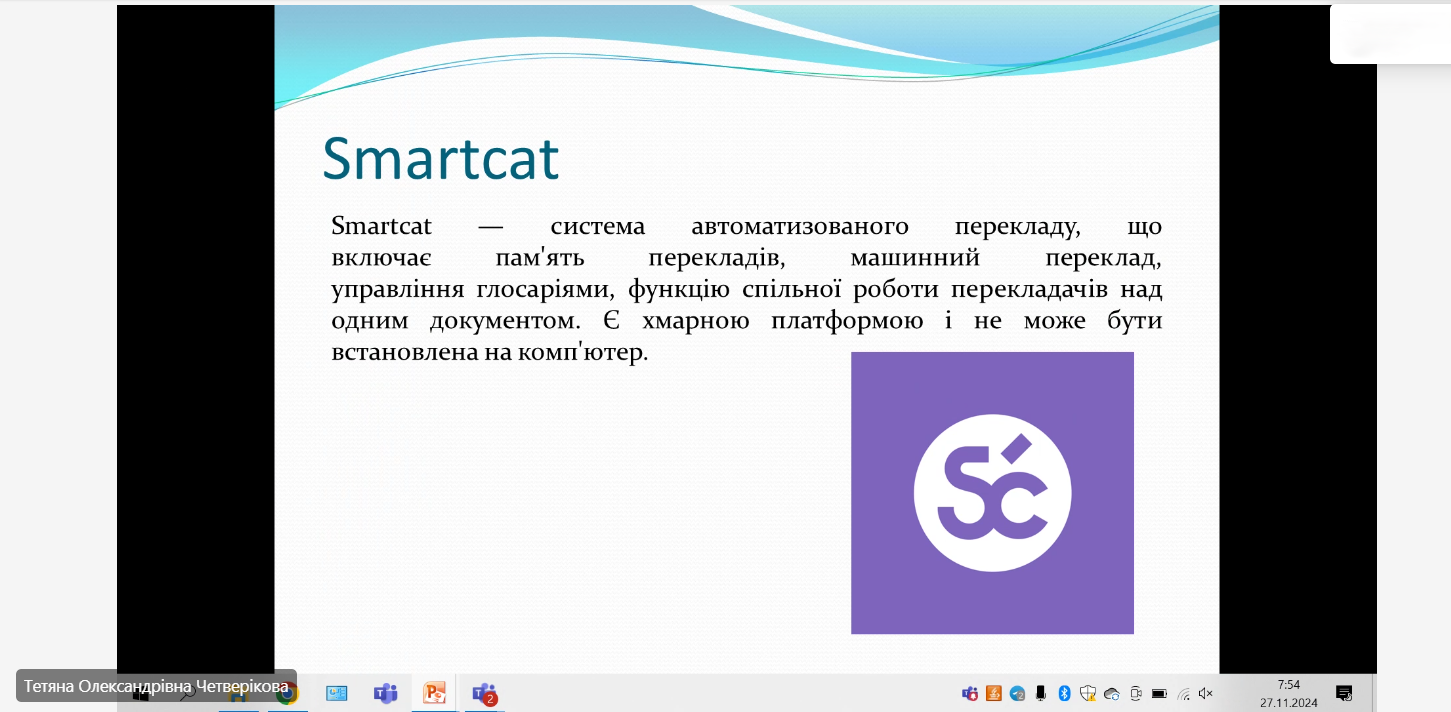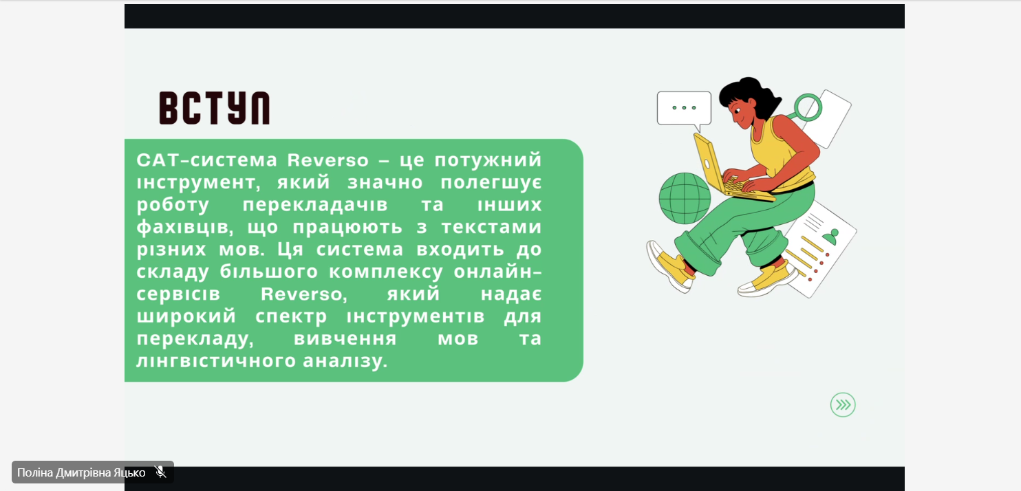 У рамках дисципліни “Автоматизований переклад” студенти 4-го курсу кафедри інтелектуальних комп’ютерних систем підготували та успішно презентували реферати, в яких детально розглянули сучасні CAT-інструменти (Computer-Assisted Translation). Заняття проводились під керівництвом доцента, к.філос.н. Юрченко Олени Миколаївни та асистентки Воржевітіної Анжеліки Ігорівни, які забезпечили студентам глибоке розуміння теми та можливість критично оцінити різноманітні програми для автоматизованого перекладу.