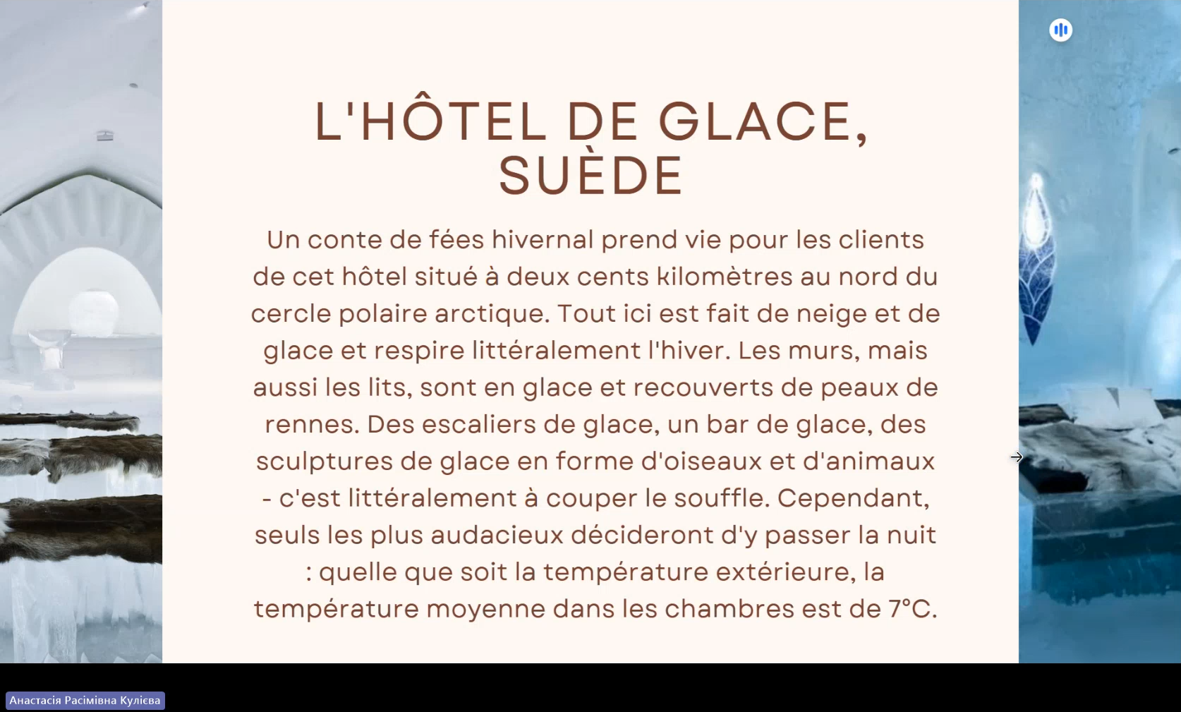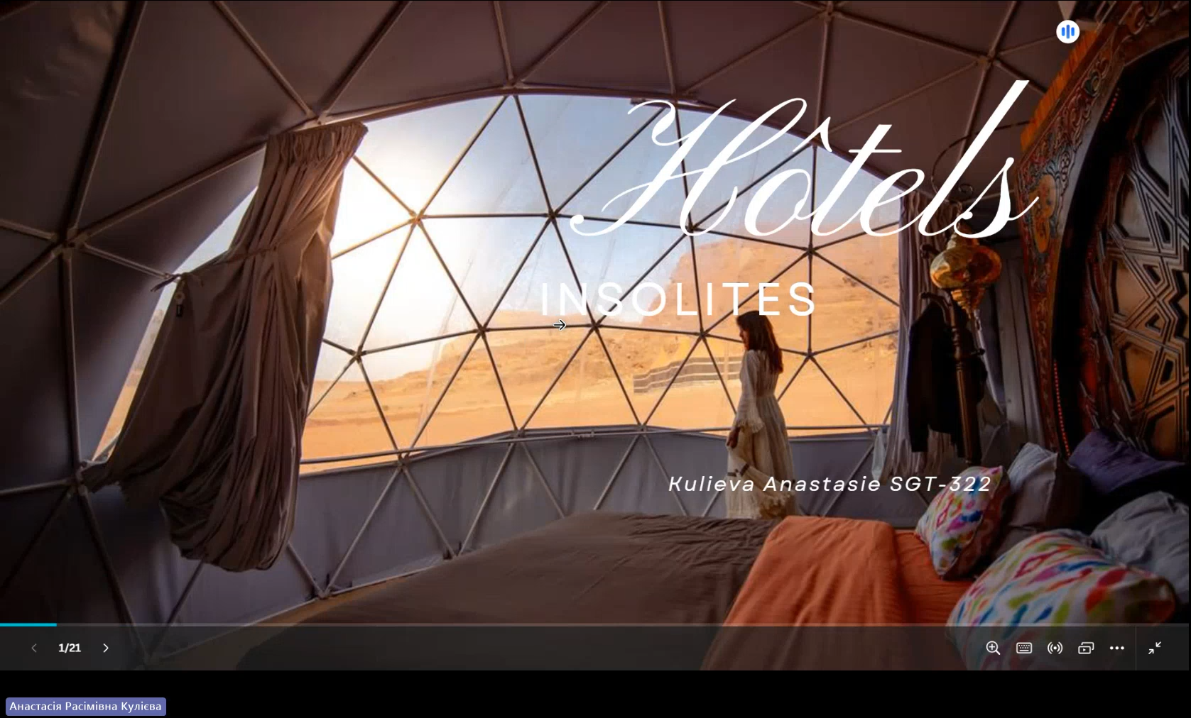 Кулієва Анастасія у своїй роботі зосередилася на темі незвичайних готелів світу. Вона розповіла про цікаві місця для проживання, які вражають своїм дизайном і концепцією. Її дослідження викликало жвавий інтерес у слухачів, які були вражені різноманіттям пропозицій.