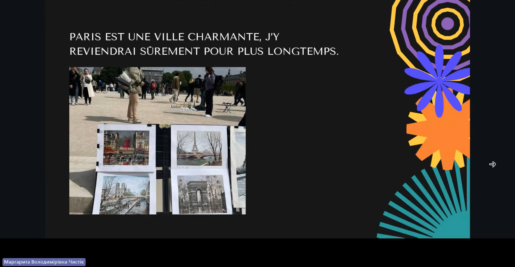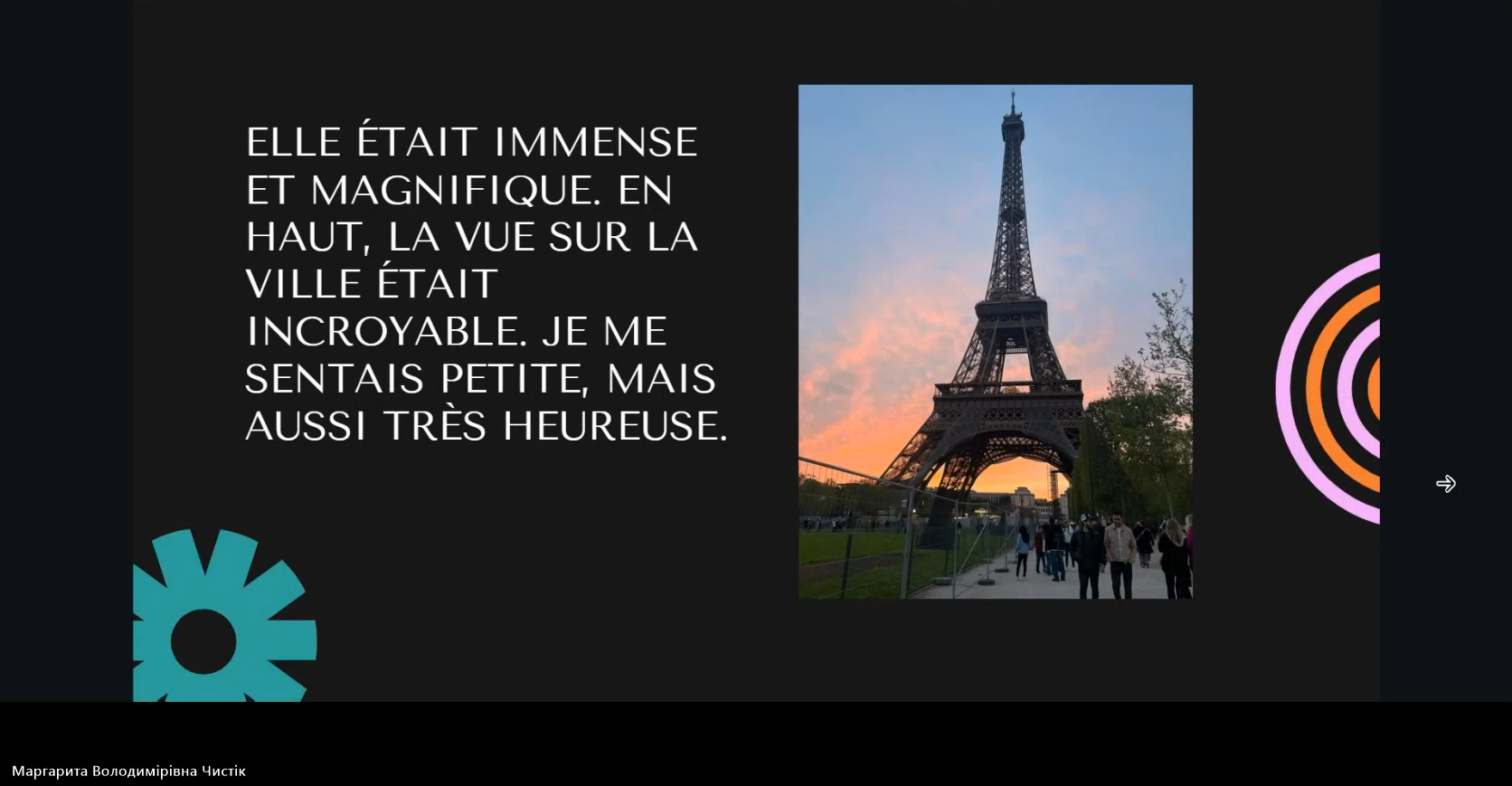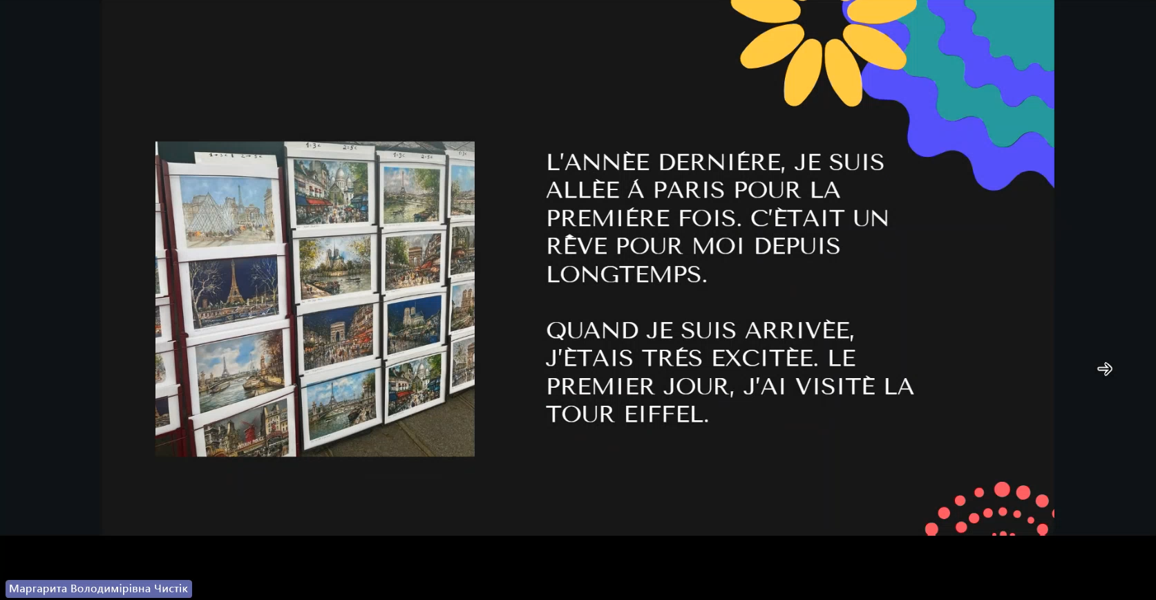Чистік Маргарита поділилася своїми враженнями від незабутньої подорожі до Парижа. Вона розповіла про відвідування знакових пам’яток, таких як Ейфелева вежа, про атмосферу міста, яка захоплює з першої миті. Її емоційна розповідь про Париж надихнула студентів на нові подорожі та відкриття.