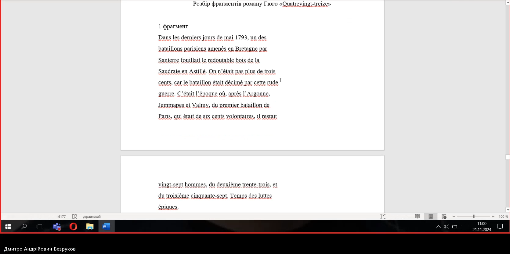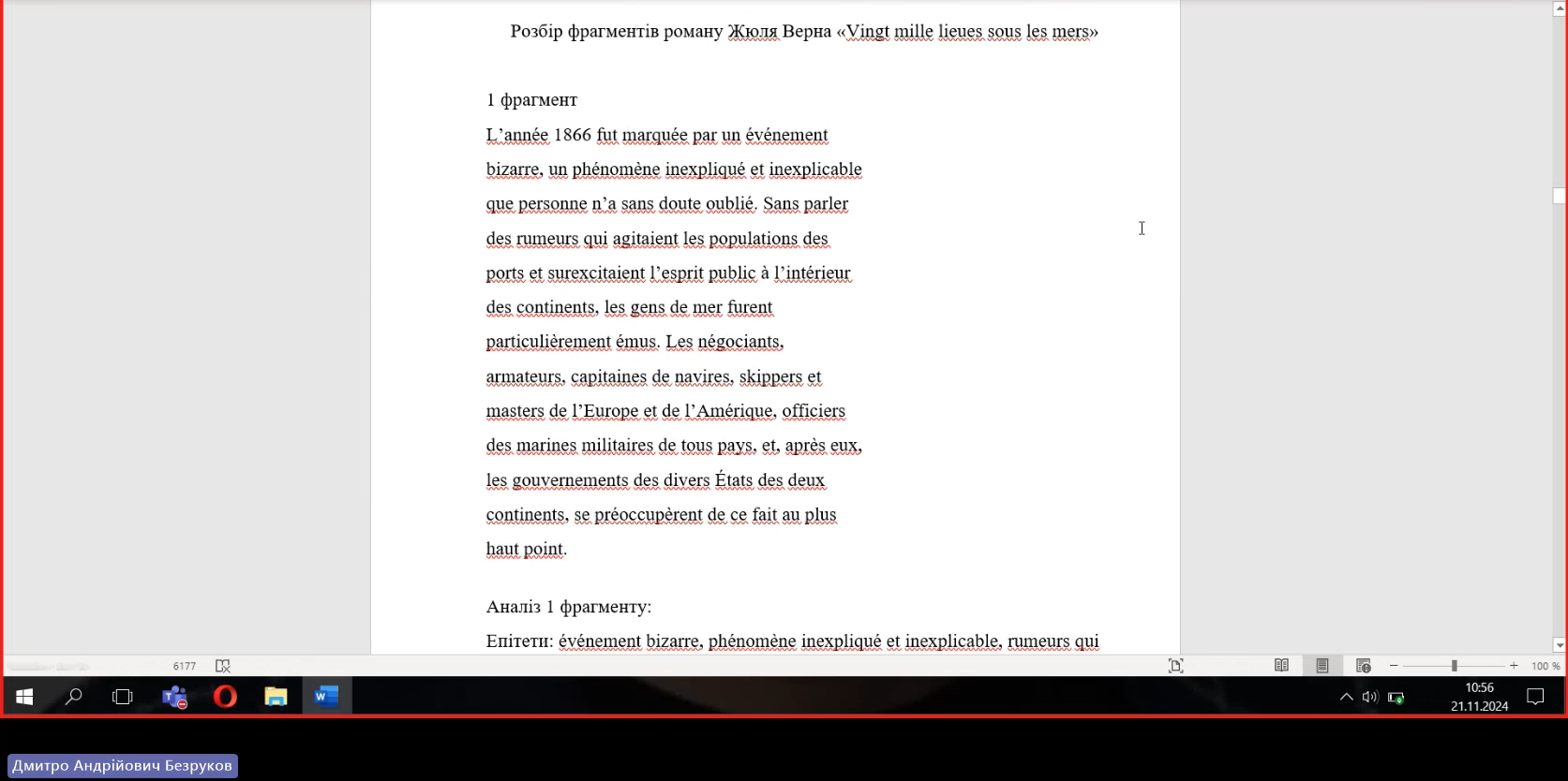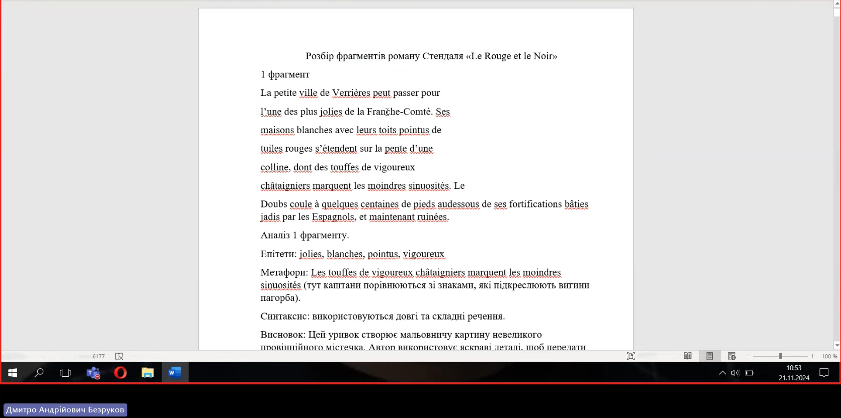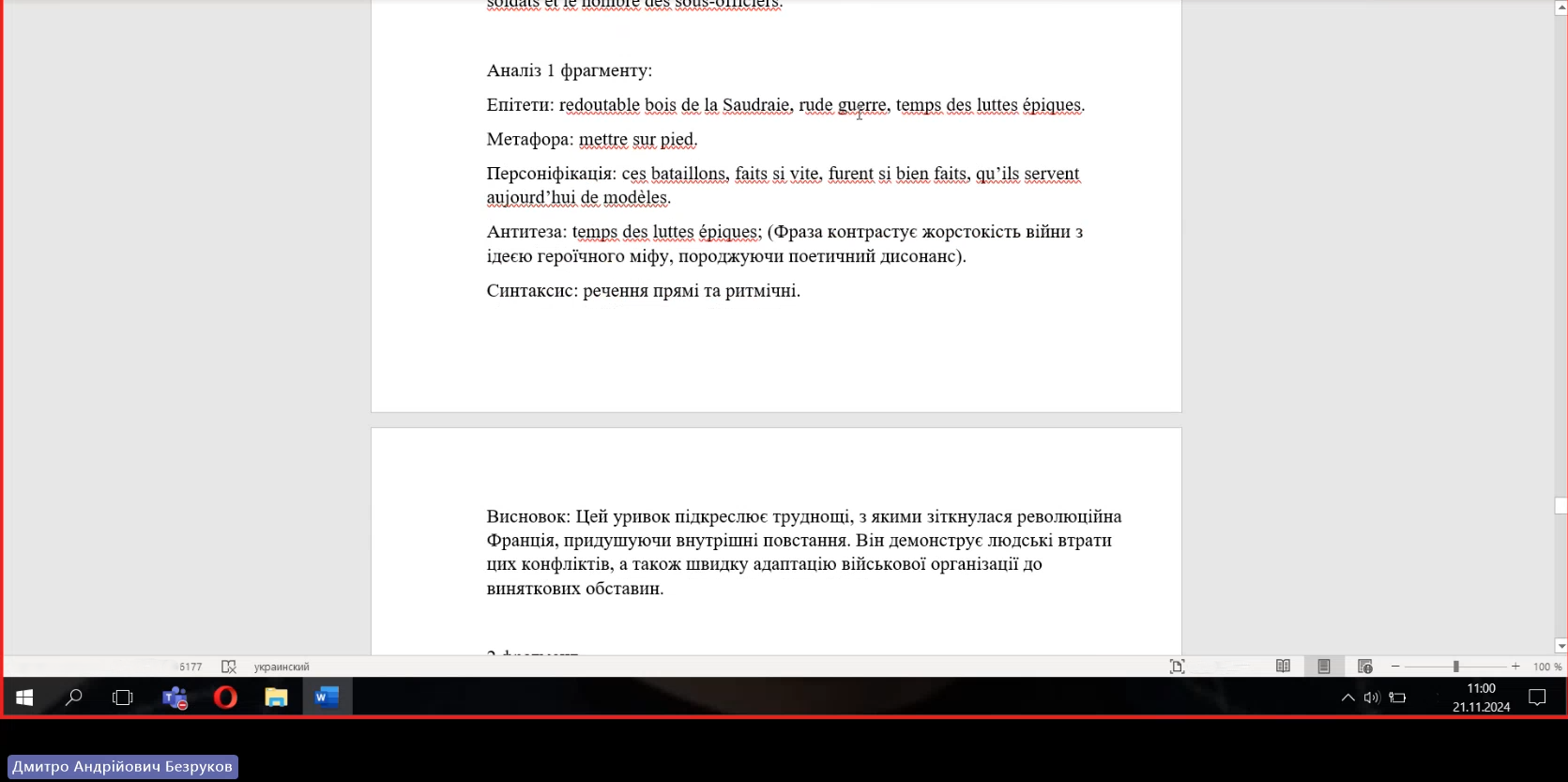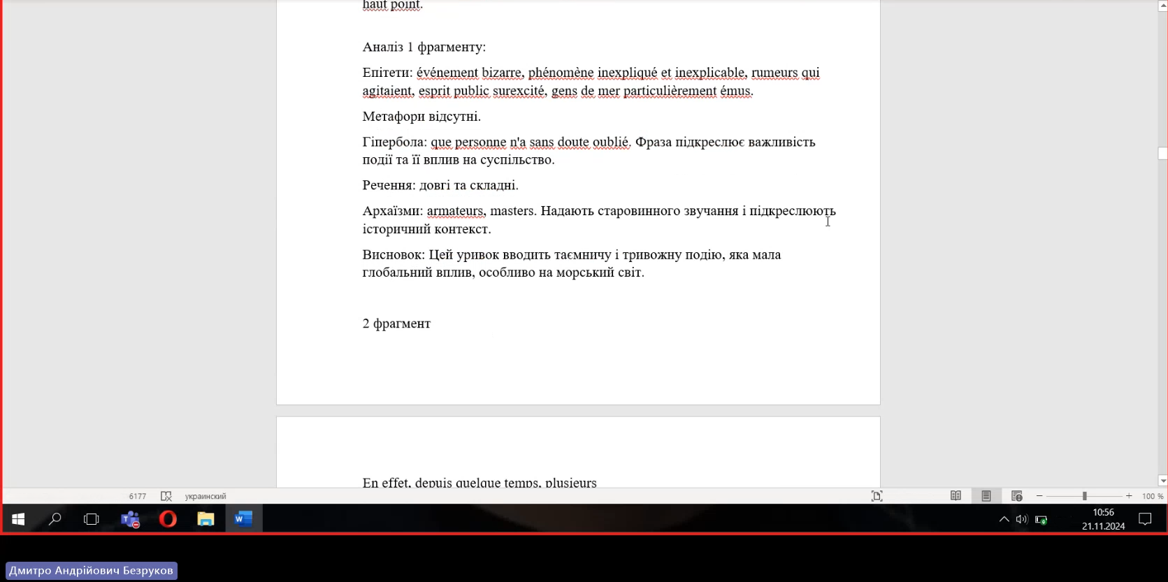 Безруков Дмитро присвятив свою роботу дослідженню творів видатних французьких письменників, глибоко проаналізувавши використання художніх засобів у відомих літературних творах, презентація, яких допомогли слухачам зрозуміти, як ці елементи впливають на сприйняття творів.