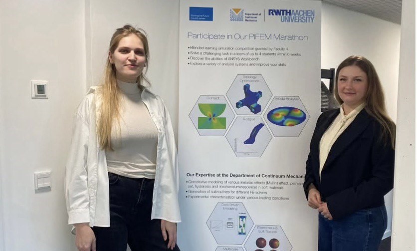 У рамках весняного етапу програми робочі візити до RWTH Aachen University здійснили директор Інституту комп’ютерного моделювання, прикладної фізики та математики НТУ «ХПІ» професор Олексій Ларін, доцентки кафедри Ксенія Потопальська та Марія Шаповалова, а також аспірантка Наталія Фоменко. Так, професор ХПІ Олексій Ларін зустрівся з німецькими науковцями щодо спільних досліджень у галузях біомеханіки та вібраційного аналізу конструкцій, виконав серію експериментів із матеріалами для 3D-друку та долучився до підготовки спільної наукової публікації. Він також узяв участь у навчальному процесі Ааахенського університету, провівши лекцію і практичний воркшоп із моделювання вільних коливань механічних систем та прочитавши окремий курс із нелінійної динаміки для аспірантів. Крім того, у лабораторіях RWTH науковиці Ксенія Потопальська та Марія Шаповалова виконали експерименти з 3D-друку та дослідили властивості аерогелів та систем із квазі-нульовою жорсткістю — важливою технологією для сучасних віброізоляційних систем, а аспірантка кафедри Наталія Фоменко протягом двох місяців проводила експеріментальні дослідження у галузі символічної регресії для побудови нелінійних в’язко-пружних моделей матеріалів. Восени Ксенія Потопальська і Марія Шаповалова повернулися до RWTH Aachen University уже як викладачки: вони проводили лабораторні заняття з моделювання 2D і 3D конструкцій, викладали курс по програмному забезбеченню для моделювання методом скінчених елементів (Practical Introduction to FEM Software) та читали лекцію щодо застосування програмного комплексу ANSYS ACP для аналізу композитних матеріалів.