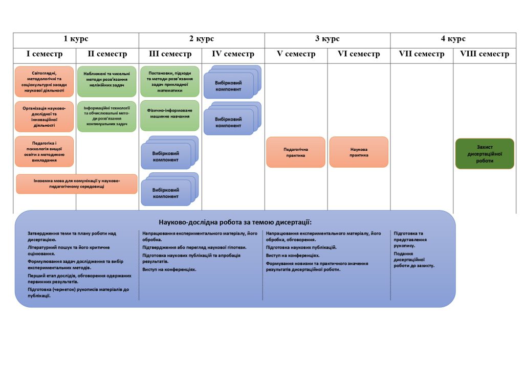 Структура програми включає освітню складову (обов’язкові та вибіркові компоненти, сформовані відповідно до наукових напрямів кафедр) і безперервну наукову складову, що передбачає проведення досліджень, публікації та апробацію результатів на конференціях. Оцінювання здійснюється через поточний і підсумковий контроль, презентації, захисти звітів і дисертації.