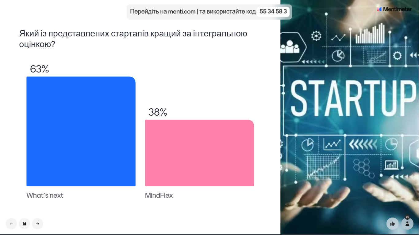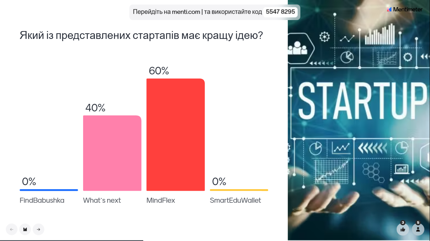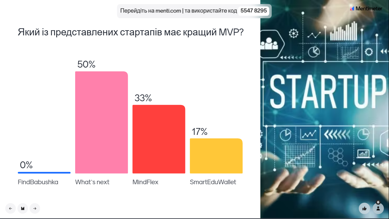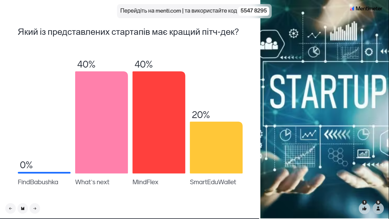 Оцінювання кожного стартап-проєкту здійснювалось сумісно студентами та експертами за допомогою онлайн сервісу для створення та проведення миттєвих опитувань Mentimeter після проведення сесії запитання-відповіді для кожного пітч-деку.