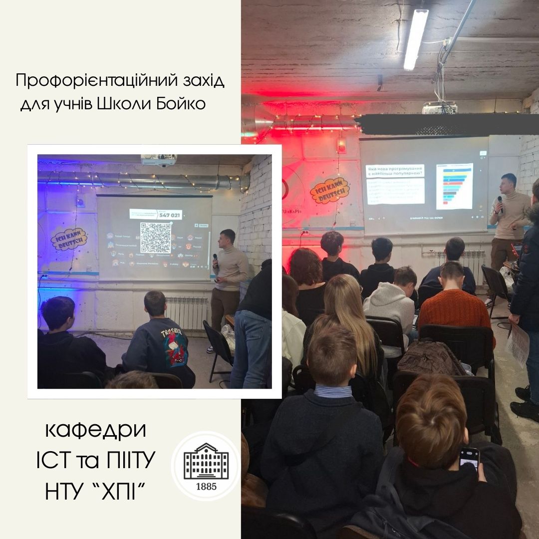 7 лютого представники кафедр “Інформаційні системи та технології” та “Програмна інженерія та інтелектуальні технології управління” НТУ “ХПІ” провели профорієнтаційний захід для учнів Школи Бойко в безпечному просторі — бомбосховищі університету. 🛡