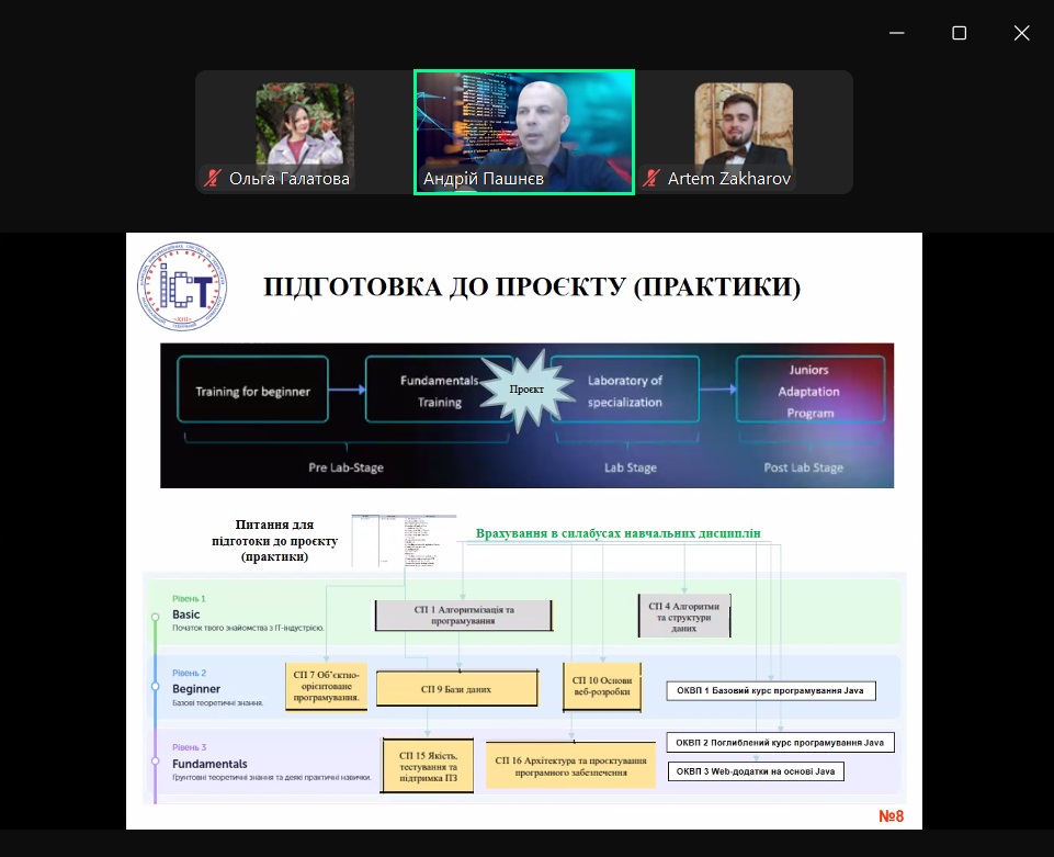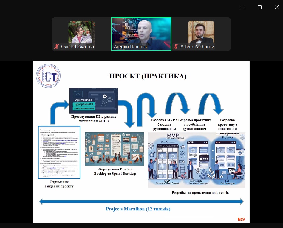 В своїй доповіді він поділився із усіма абітурієнтами, викладачами та вчителями, присутніми під час проведення круглого столу, трирічним досвідом реалізації проєктного підходу в процесі підготовки бакалаврів кафедри ІСТ, що базується на організації освітнього процесу навколо виконання студентами проєктів, які відображають реальні завдання із проєктування та розробки програмного забезпечення у відповідності до сучасних вимог ІТ-індустрії. Такий підхід дозволяє забезпечити студентів кафедри не лише теоретичними знаннями, а й практичними навичками, необхідними для ефективного вирішення реальних завдань у сфері розробки програмного забезпечення інформаційних систем.