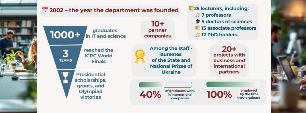 The Department of Computer Mathematics and Data Analysis is the place where – це місце, де 👉 numbers turn into solutions, 👉 and the students – into the first-class specialists in the field of Data Science, artificial intelligence, and mathematical modeling. We teach not only to work with data but also to see patterns, make forecasts, and create artificial intelligence technologies.