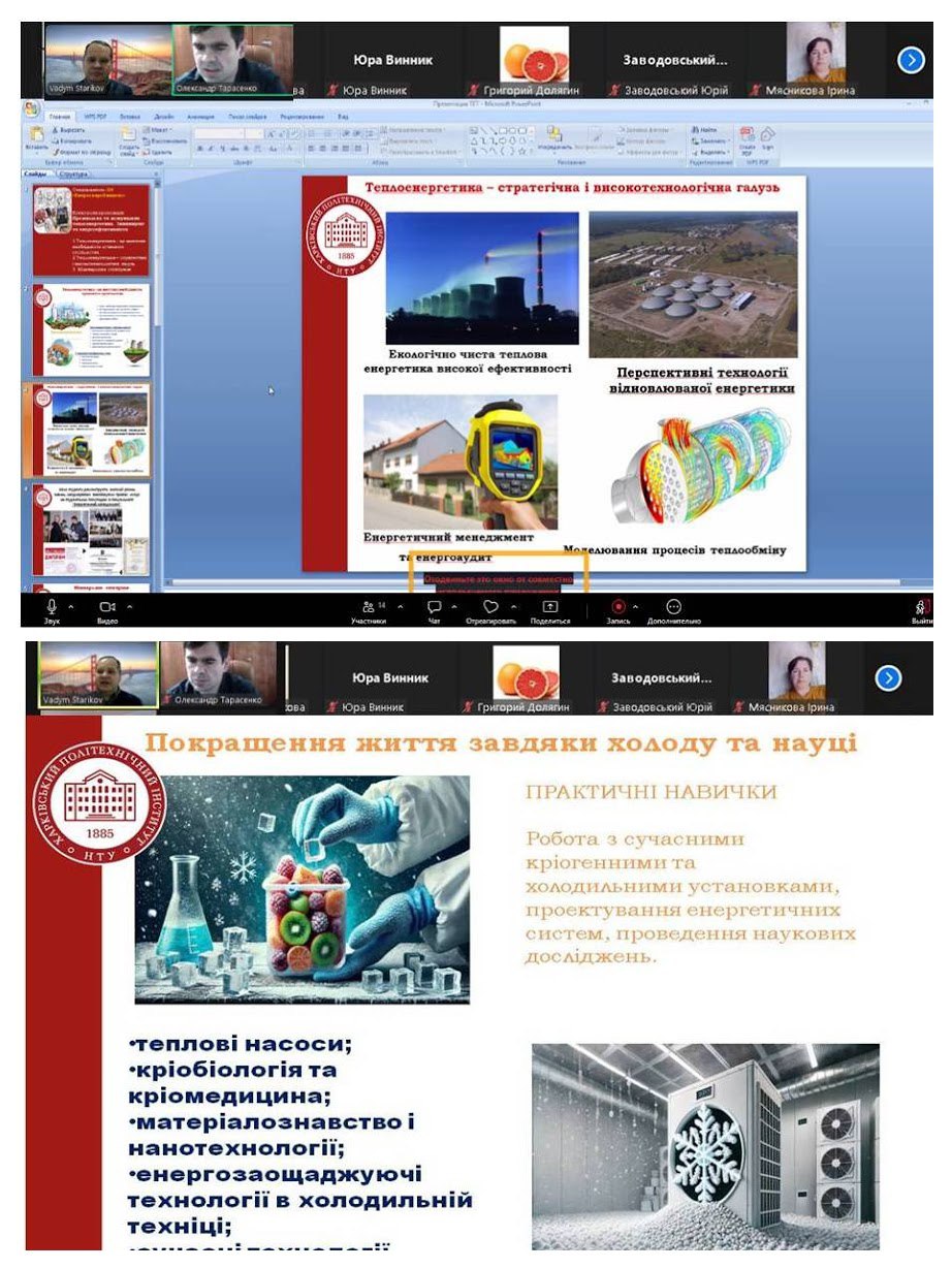 У доступній та цікавій формі учасникам було представлено особливості спеціальності, перспективи навчання та подальшого працевлаштування, а також актуальність професії теплоенергетика в умовах сучасних викликів енергетичної галузі. Під час зустрічі школярі ознайомилися з напрямами діяльності кафедри, освітніми можливостями, сучасними технологіями у сфері теплотехніки та енергоефективності.