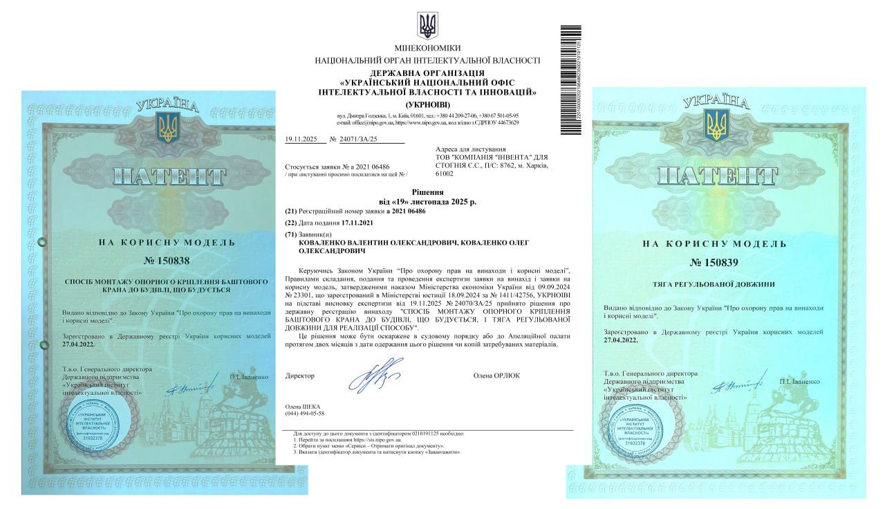Цьому передувало отримання двох Патентів України на корисні моделі «Тяга регульованої довжини», №150839, Бюл. № 17 від 27.04.22 р . та « Спосіб монтажу опорного кріплення баштового крана до будівлі, що будується», №150838, Бюл. № 17 від 27.04.22 р.