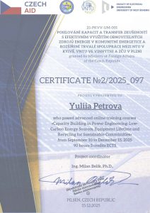 Старший викладач кафедри Петрова Юлія Володимирівна пройшла курси підвищення кваліфікації онлайн. «Розвиток потенціалу в енергетиці: низьковуглецеві джерела енергії, термін експлуатації обладнання та переробка для сталого розвитку громад» з 10 вересня по 15 грудня 2025 року, 90 годин, 3 кредити ECTS.
