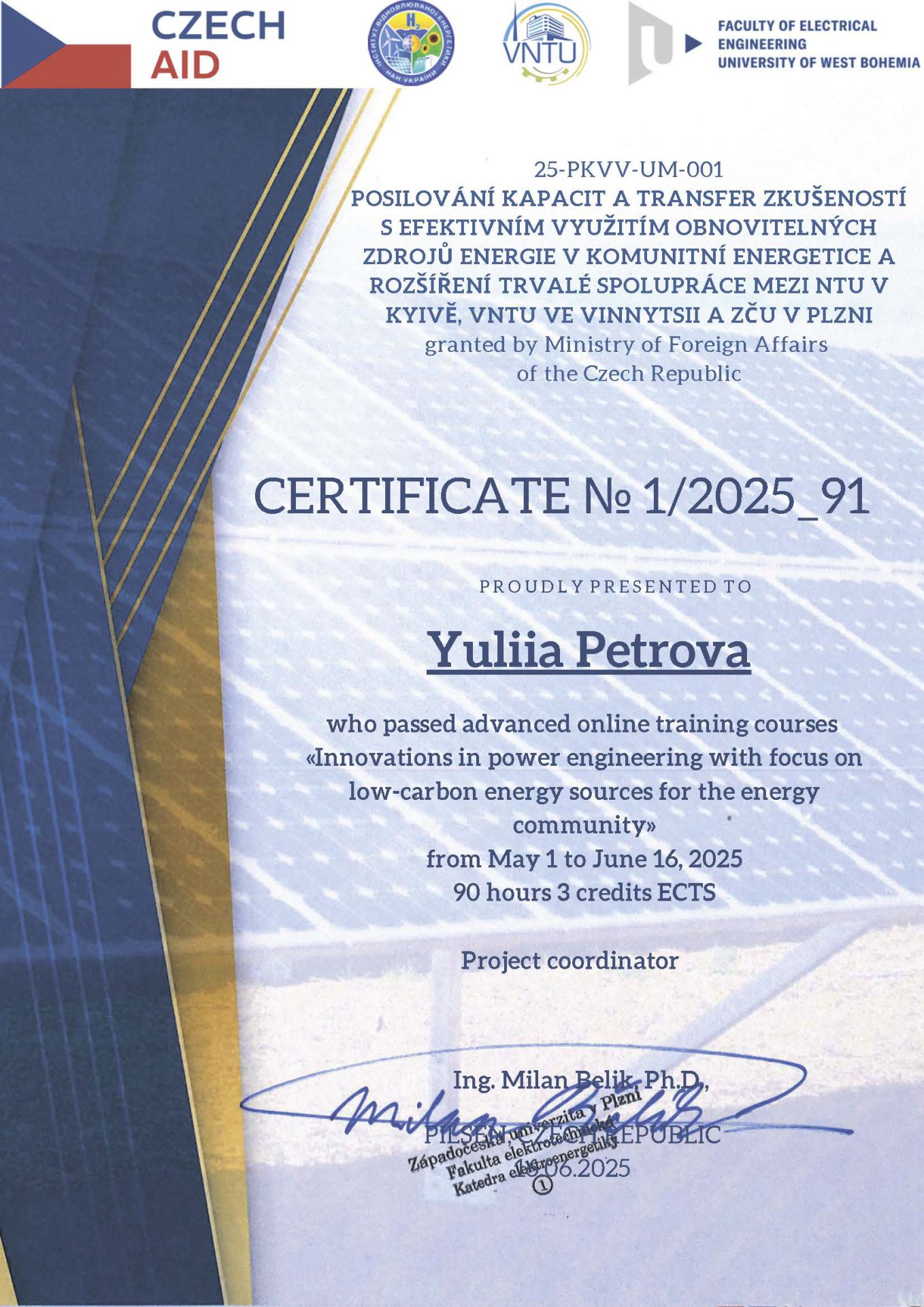 Старший викладач кафедри Петрова Юлія Володимирівна пройшла курси підвищення кваліфікації онлайн. «Розвиток потенціалу в енергетиці: низьковуглецеві джерела енергії, термін експлуатації обладнання та переробка для сталого розвитку громад» з 10 вересня по 15 грудня 2025 року, 90 годин, 3 кредити ECTS.