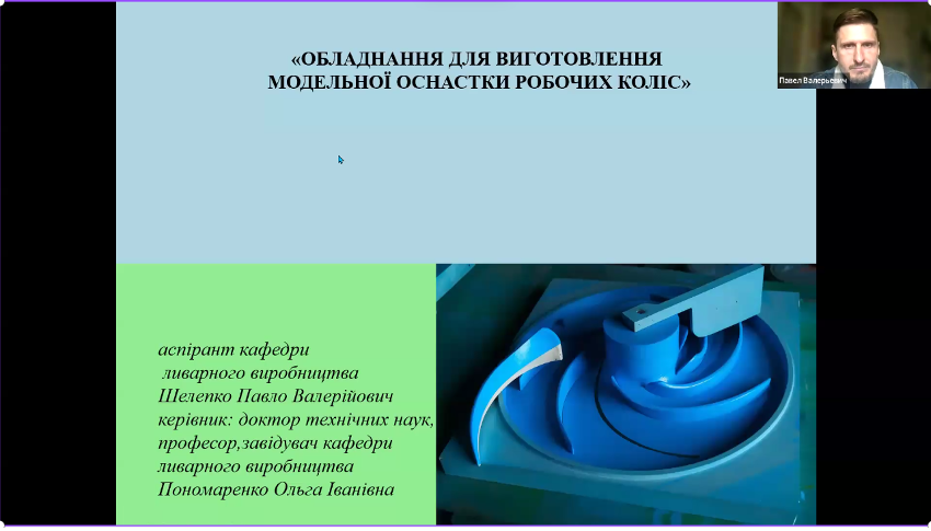 Аспірант кафедри Шелепко Павло Валерійович зробив доклад на тему “Обладнання для виготовлення модельної оснастки робочих коліс”. Керівник д.т.н., проф., завідувач кафедри ливарного виробництва Пономаренко Ольга Іванівна.