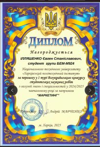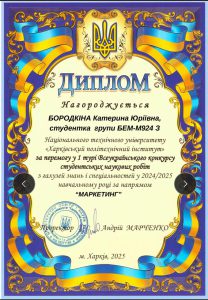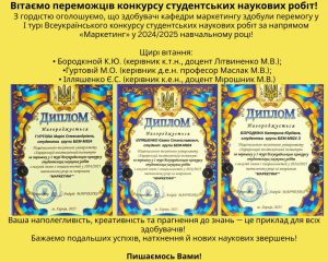 З гордістю оголошуємо, що здобувачі кафедри маркетингу здобули перемогу у І турі Всеукраїнського конкурсу студентських наукових робіт за напрямом «Маркетинг» у 2024/2025 навчальному році!