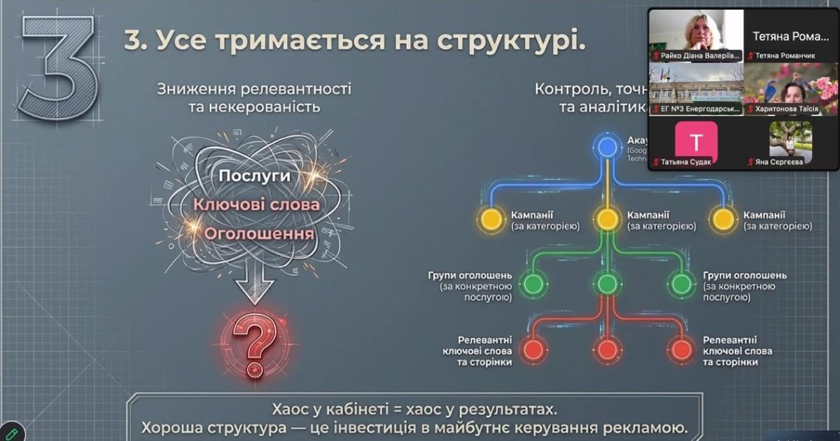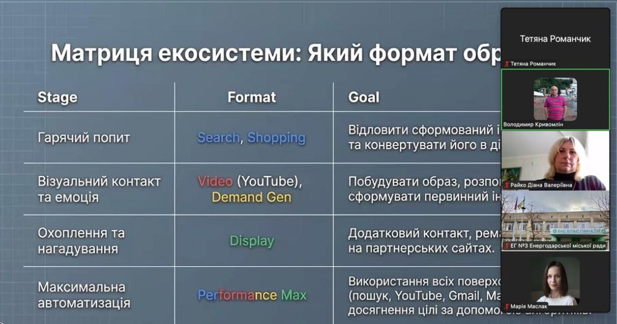 У межах зустрічі було розглянуто сучасні підходи до використання digital-інструментів у навчальному процесі, зокрема можливості платформи Google Ads, логіку створення рекламних кампаній та підходи до їх оптимізації 📊