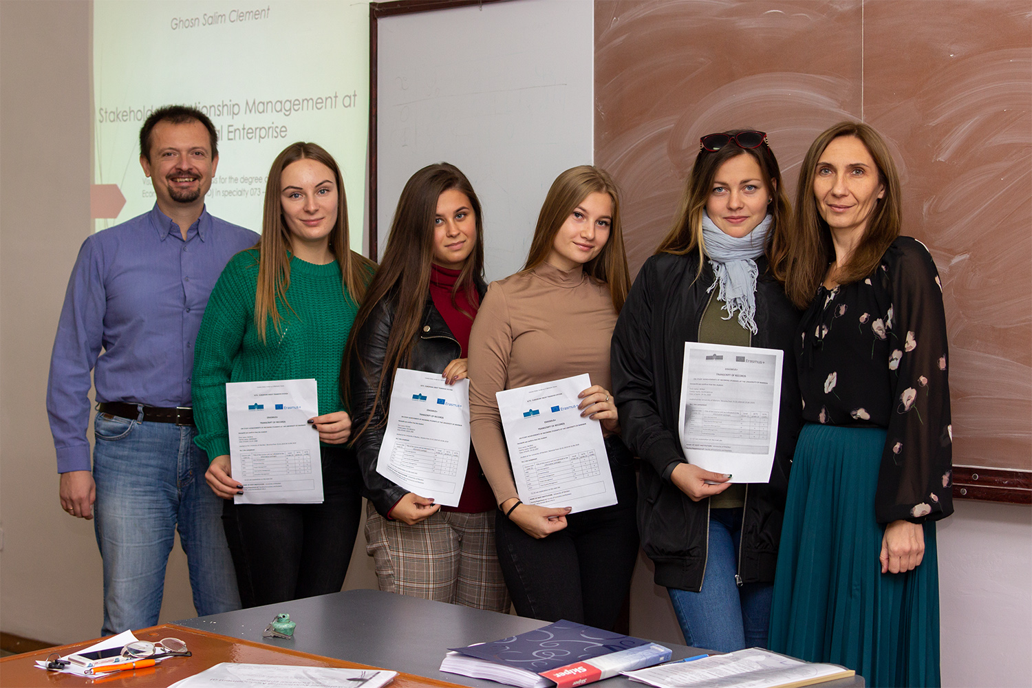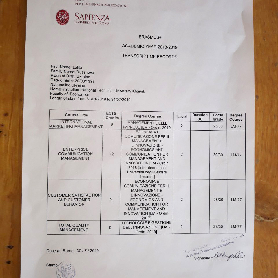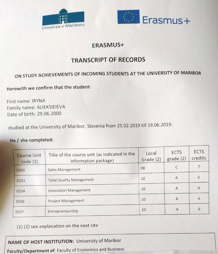 Ірина Алєксєєва, Поліна Волобуєва, Марія Дегтяр, Марія Сидренок та Лоліта Русанова , яких було направлено в рамках програми Еразмус+ кафедрою менеджменту та оподаткування у весняному семестрі 2018/2019 року до Університету Марібору (Марібор, Словенія) та Університету Сапіенца (Рим, Італія), нарешті отримали свої сертифікати успішності!