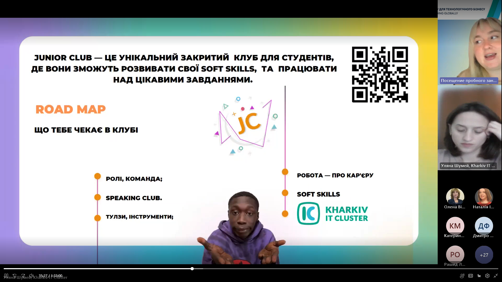 Найважливішою частиною зустрічі було знайомство з проєктами, які ініціює освітня команда Кластера для студентів, а саме, Open IT, Junior Club, Guest EDU, Boot Camp. Окрім цього Олена наголосила, що студенти університетів-партнерів мають можливість проходити практику з можливістю подальшого працевлаштування в компаніях, які входять до спільноти Харківського ІТ Кластера.